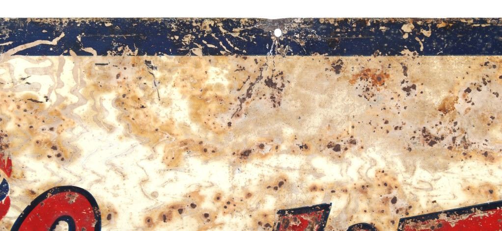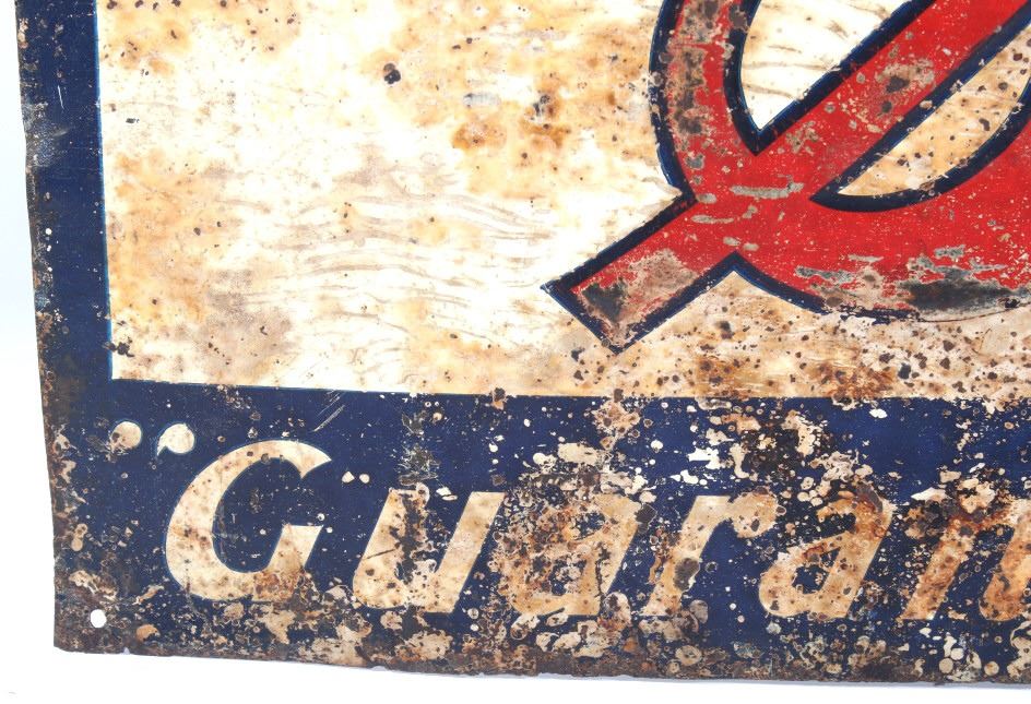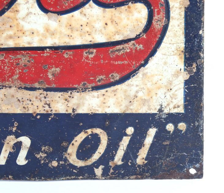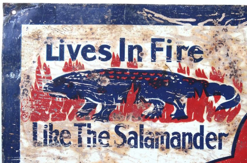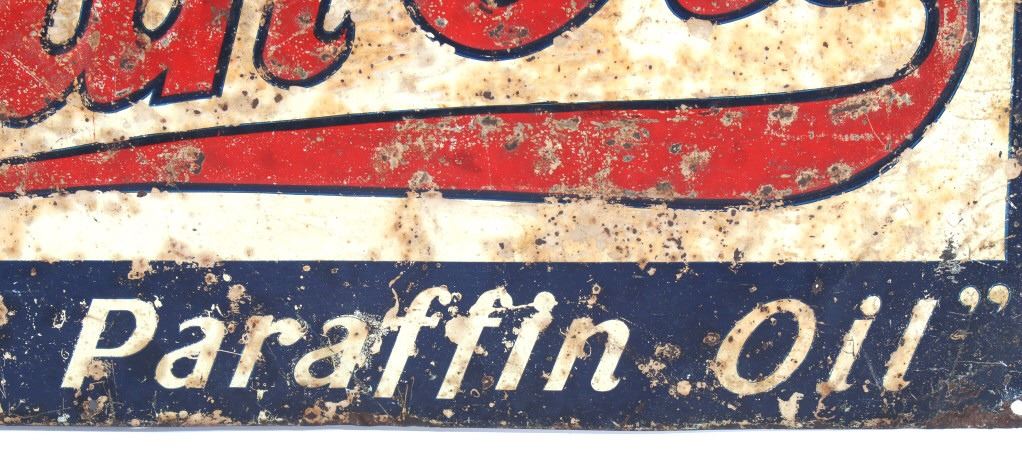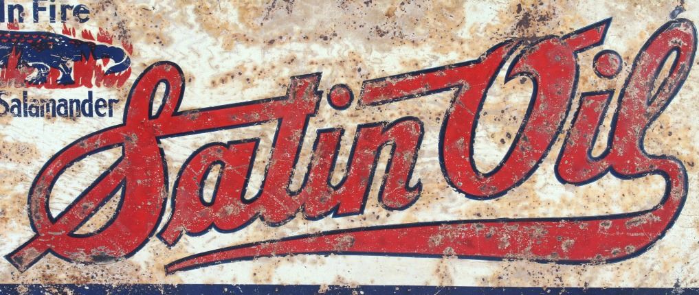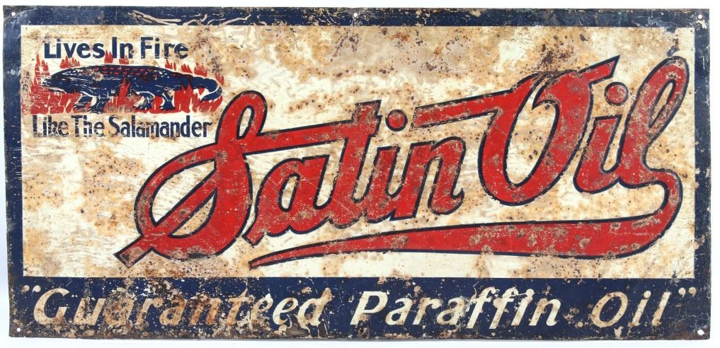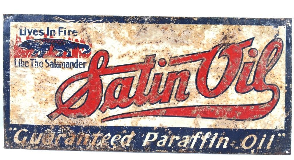 Available in this lot we have a Satin Oil metal advertising sign originating from the 1930's. The sign features a off-white colored background with a dark blue border and embossed lettering. The sign is marked in the upper left corner "Lives In Fire Like The Salamander" with a image of a salamander surrounded by flames. The center of the piece is marked "Satin Oil" with "Guaranteed Paraffin Oil" across the bottom. The sign shows fair condition for its age with wear, discoloration, and rust across the face of the sign. The piece measures 27 1/2" wide by 13" tall.