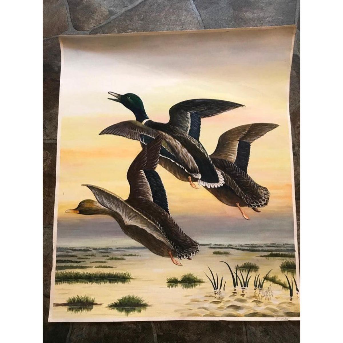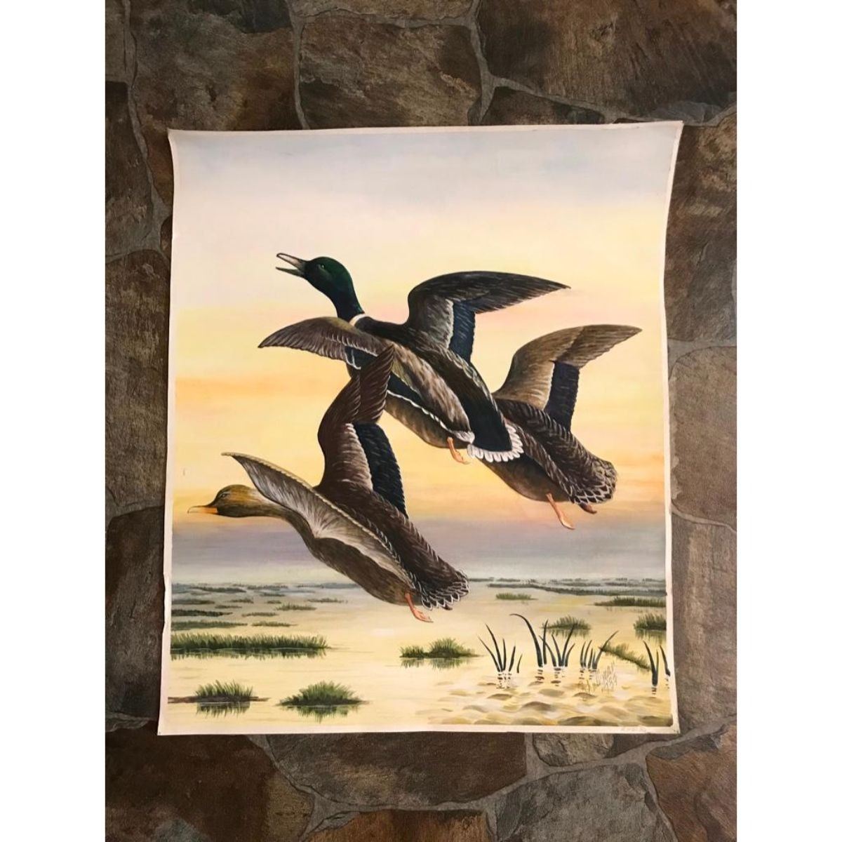 20th Century original watercolor painting on paper. Ducks In Flight, signed Shullman, dated 1933, lower right. 20" X 24". Unframed. * some creasing to top of painting with minor staining from age & storage.