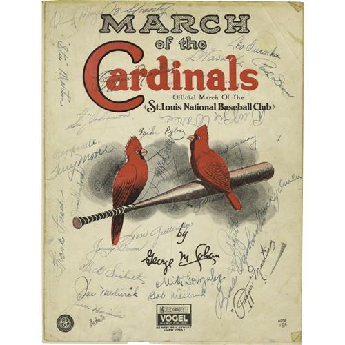 <B>1930's St. Louis Cardinals Multi-Signed Sheet Music with Dean Brothers, Medwick.</B></I> The colorful cover of this 1937 sheet music for a George M. Cohan composition provides an attractive home for the autographs of close to thirty pre-war members of the Cardinals family. Joining the superstar pitching duo of Dizzy and Daffy Dean are Medwick, Frisch, Haines, Mize, Durocher, Wares, Owen, Si Johnson, Warneke and more. A pair of Pepper Martin autographs are stamped. All signatures rate 9/10 or better. Sheet music shows scattered creasing and edge wear, but as our catalog imagery should properly illustrate, the visual beauty is not diminished by these concerns. It remains affixed to cardboard backing, but could likely be removed with little damage to back page. <I>LOA from PSA/DNA. LOA from James Spence Authentication.</B></I><BR><BR><b>Shipping:</b> Flat Material, Small (<a target="_blank" href="http://www.heritageauctions.com/common/shipping.php">view shipping information</a>)