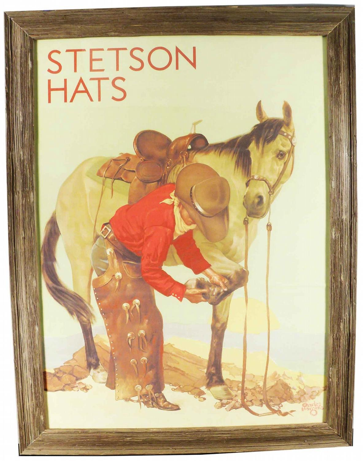 1930's Stetson Poster. Illustration by Charles Hargens. Framed under glass. Very minor wrinkles otherwise excellent condition. 29 1/2 X 40 inches image only.