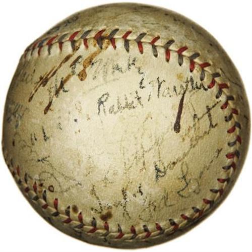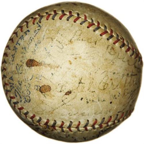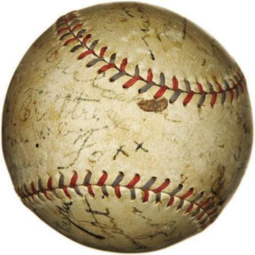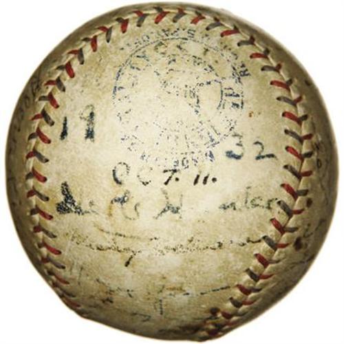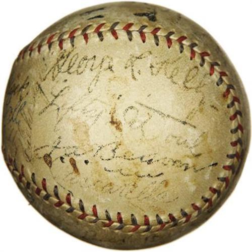 <B>1930's Tour of Japan/Hawaii Signed Baseball with Ruth, Gehrig, Foxx.</B></I> The handwritten date of October 11, 1932, penned by parties unknown, throws us for a bit of a loop here, as the collection of autographs that coat the surface of this OAL (Harridge) ball appear to be those of 1931 and 1934 Tourists, as well as some who were a part of neither. We'll accept this bit of mystery, though, and turn our concentration toward the princely assortment of names that decorate its surface. As is the case with any great "Tour ball," this one begins with Ruth (1/10) and Gehrig (2/10), moving on to the likes of Foxx (3/10), Mack (7/10), Gehringer (3/10), Cochrane (2/10), Appling (1/10), Lyons (3/10), Kelly (6/10), McNair (3/10) and more. Signature quality dips low enough at times that an exact count is impossible, but all listed above are readily legible. Some staining and surface wear are noted. Certainly not a pristine sphere, but an opportunity for the budget-minded collector to bring many of the game's greatest names into his private collection. <I>LOA from PSA/DNA. LOA from James Spence Authentication.</B></I><BR><BR><b>Shipping:</b> Balls, Pucks, etc., Small (<a target="_blank" href="http://www.heritageauctions.com/common/shipping.php">view shipping information</a>)