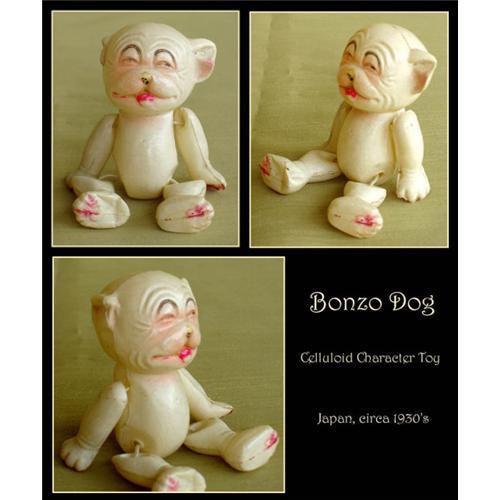 Great find.... scarce nicely detailed character toy - celluloid Bonzo dog. Very good condition considering its age and material. Few minor dents on feet as pictured, otherwise all intact. There is a mark on the back, which appears to be Japan. Dimension approx. 3 inches high, circa 1930?s