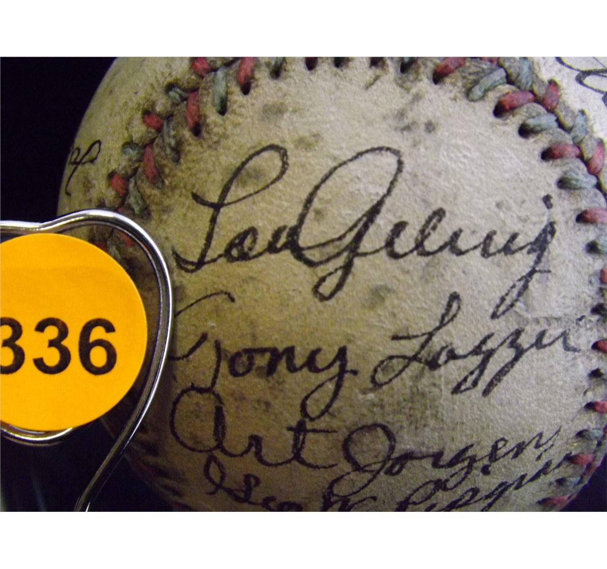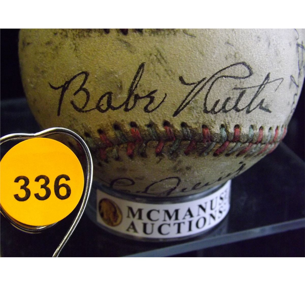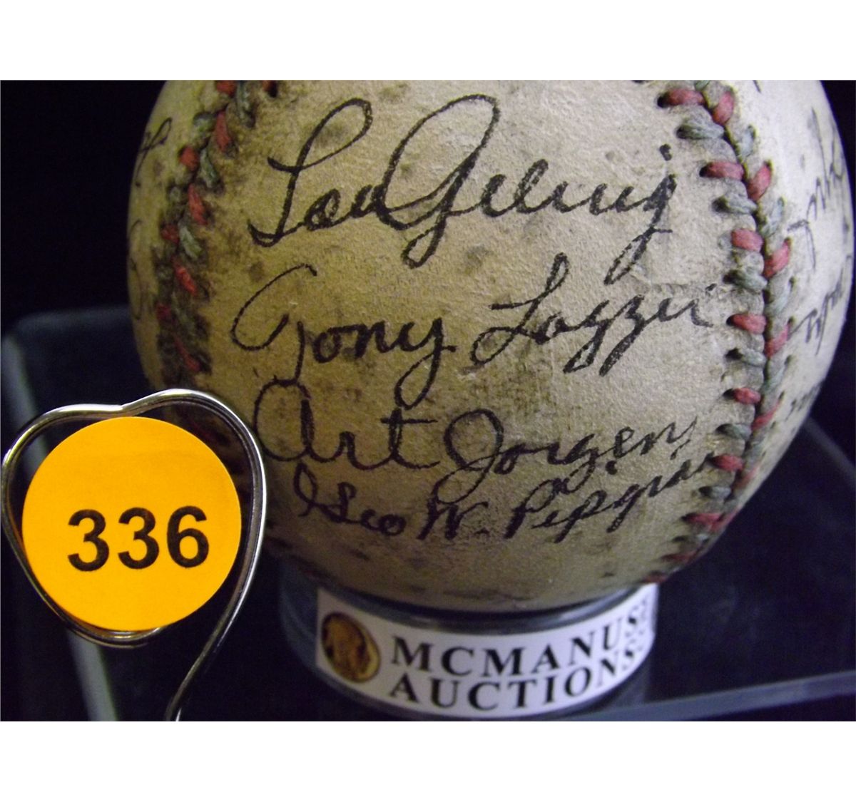 1930's Yankees Team Ball autographed by Frank Crosetti, Cy Perkins, Earle Combs, Same Byrd, Babe Ruth, Myril Hoag, Bill Dickey, Ben Chapman, Joe Glenn, Joe Sewell, Lou Gehrig, Tony Lazzeri, Art Jorgens, George Pipgras, Walter Brown, Lefty Gomez and Don Heffner. Appraised or estimated retail value $150,000. COA by Christopher Morales. All Sales Final. Please see terms and conditions of auction.
