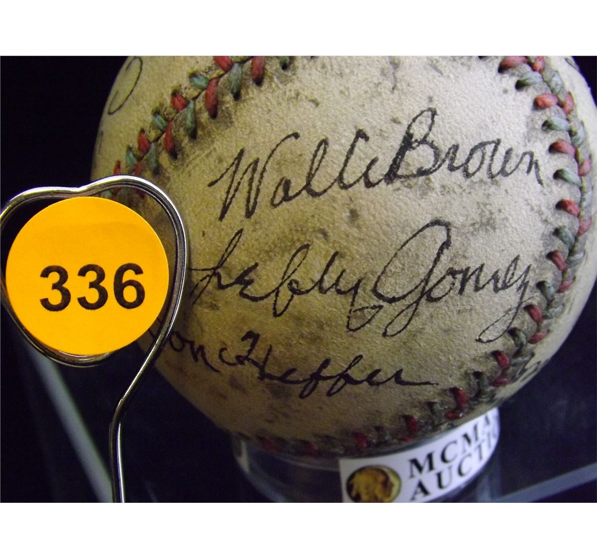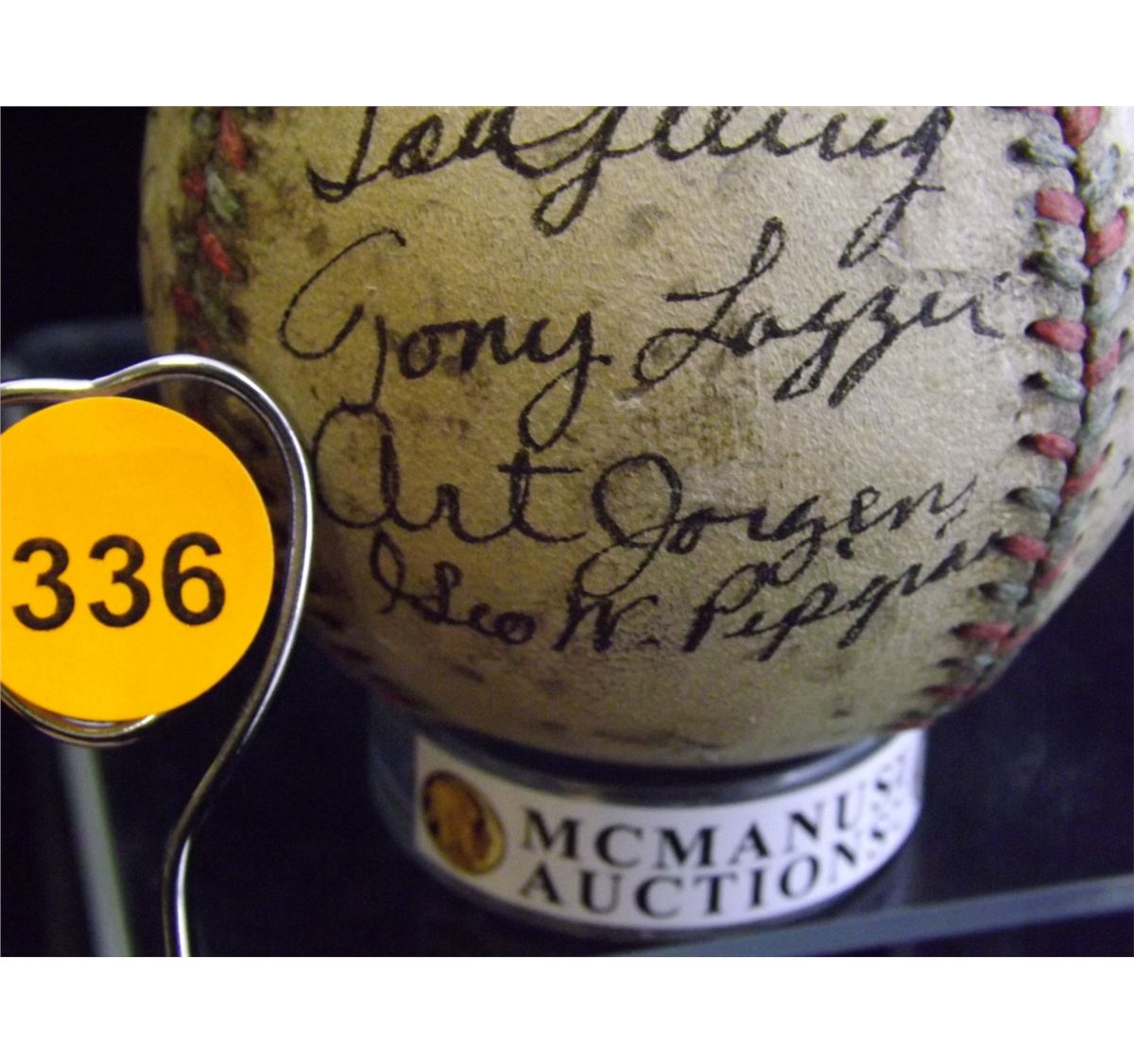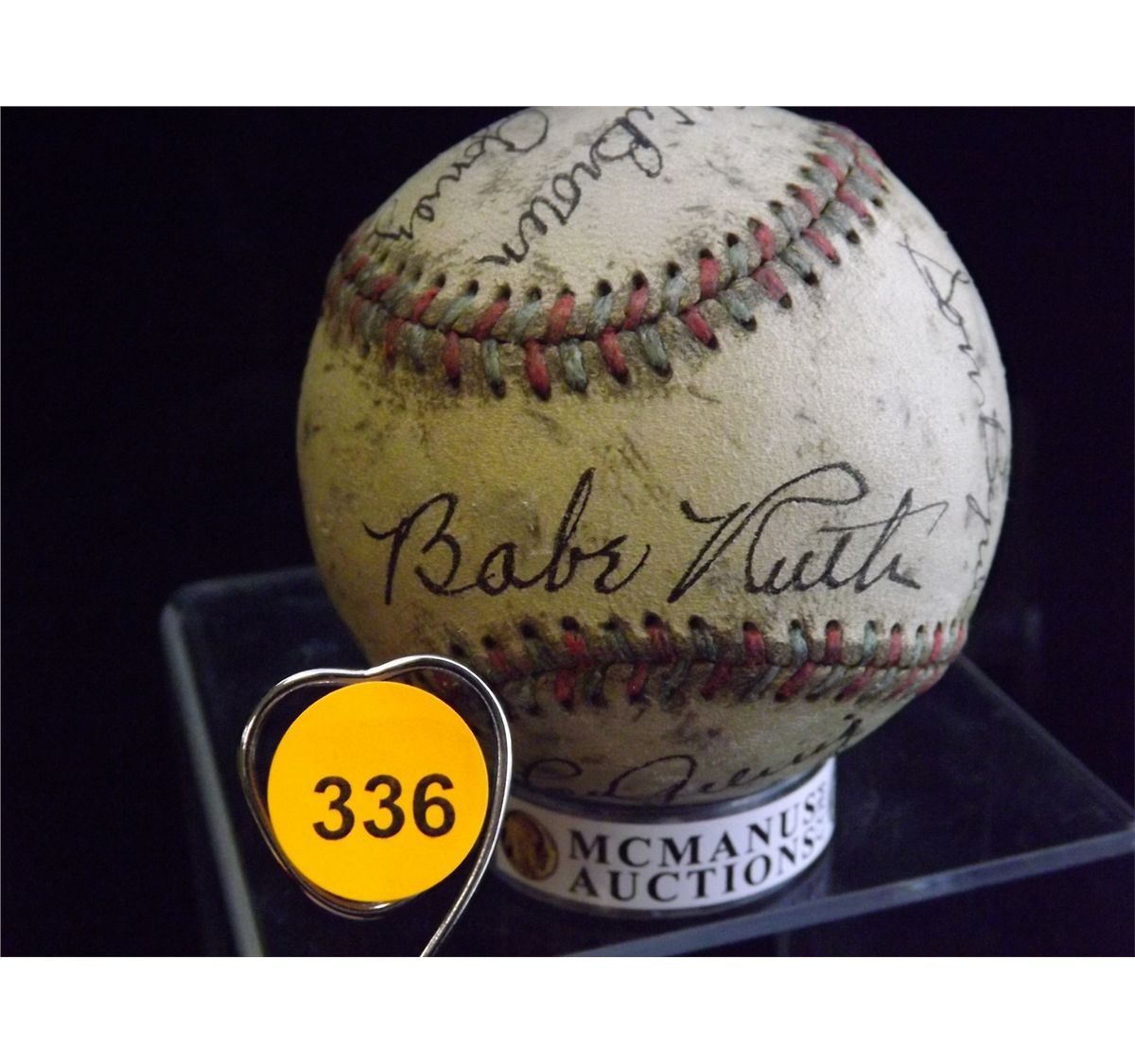 1930's Yankees Team Ball autographed by Frank Crosetti, Cy Perkins, Earle Combs, Same Byrd, Babe Ruth, Myril Hoag, Bill Dickey, Ben Chapman, Joe Glenn, Joe Sewell, Lou Gehrig, Tony Lazzeri, Art Jorgens, George Pipgras, Walter Brown, Lefty Gomez and Don Heffner. Appraised or estimated retail value $150,000. COA by Christopher Morales. All Sales Final. Please see terms and conditions of auction.