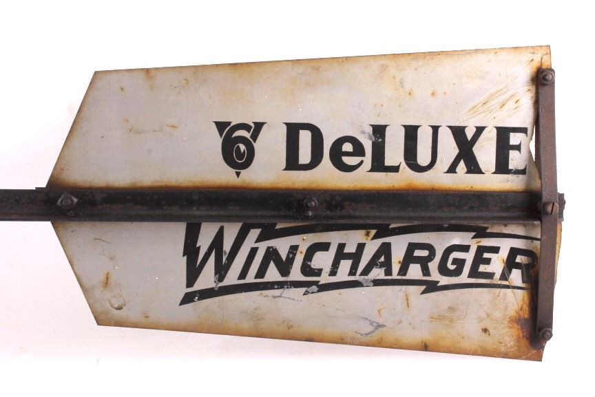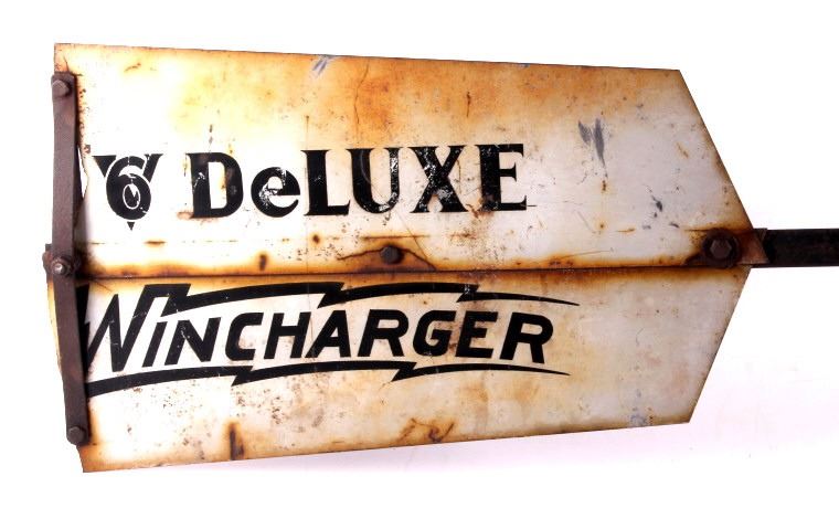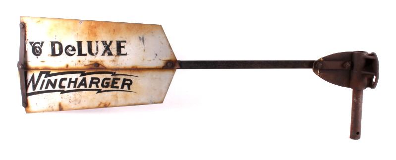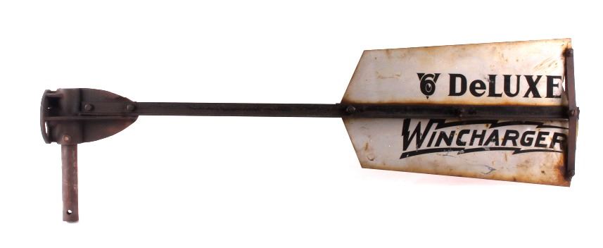 This is a Zenith windcharger tail fin from the 1930's. The tail is marked "V6 Deluxe Wincharger". The Zenith windcharger was used to power farm radios. The tail fin is in good overall condition. It measures 12" x 43".
