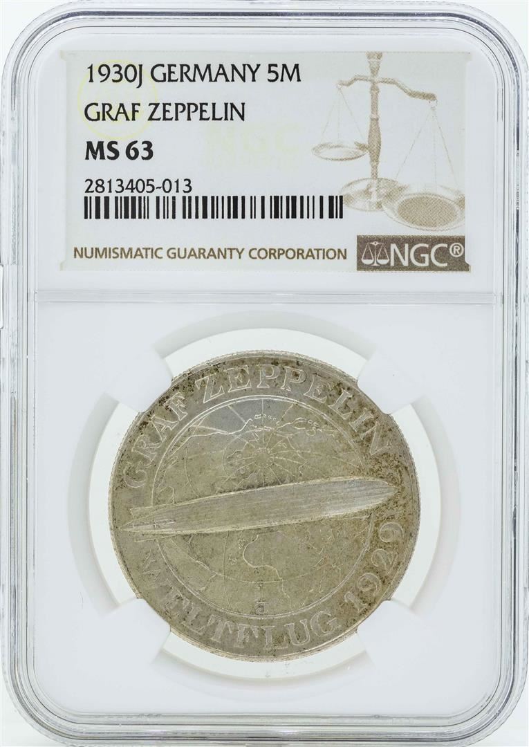 One 1930J Germany 5 Marks Graf Zeppelin Coin NGC MS63. NGC Certified.