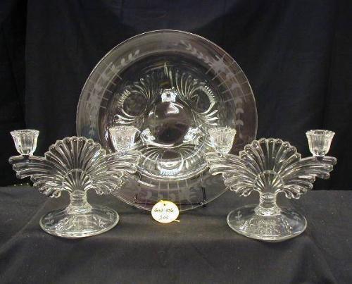 1930S AMERICAN ETCHED 3 PC. COMPOTE SET INCLUDES (1) 12 1/4in 3 FTD BOWL, (2) 6inT DBL. CUP CANDLE HOLDER, 3 PC EXCELLENT