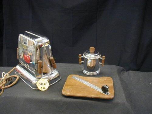 1930'S CHROME & MAHOGANY 3 PC KITCHEN ACESS. SET INCLUDES (1) FOLD DOWN TOASTER MONTGOMERY WARD CAT #04/KW/86/4881, (1) COVERED SUGAR, (1) BREAD SLICER W/BAKELITE HND. 3 PC