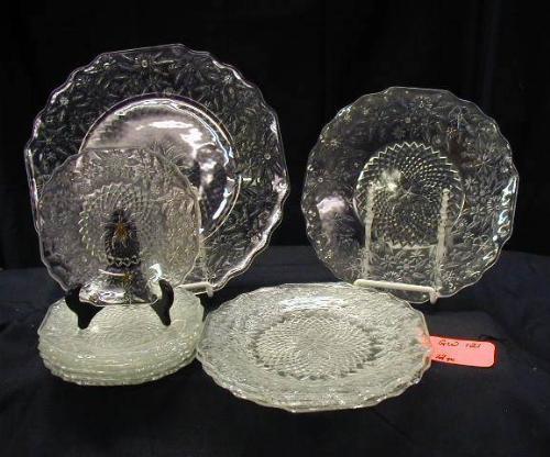1930'S CLEAR DEPRESSION PINEAPPLE & FLORAL #618 INCLUDES (1) 11 1/2in SANDWICH PLATE, (1) 9 3/8in DINNER PLATE, (3) 8 3/8in SALAD PLATE ( 1 HAS FLAKE), (7) SAUCERS, 12 PCS