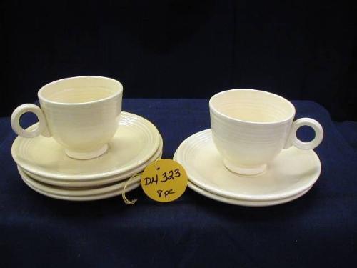1930'S HOMER LAUGHLIN FIESTA IVORY INCLUDES (2) TEA CUPS UNMARKED (1 W/MFG FLAW ON RIM), (6) SAUCERS 4-STAMPED 2-UNMARKED, 8 PC EXCELLENT