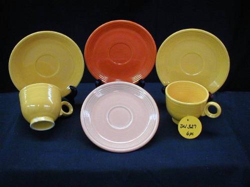 1930'S HOMER LAUGHLIN FIESTA RED & YELLOW CUPS & SAUCERS INCLUDES (2) YELLOW UNMARKED TEA CUPS (1 W/CHIP), (2) YELLOW SAUCERS 1-STAMPED 1-UNMARKED, (1) 1990'S NEW PINK SAUCER STAMPED, 6 PCS