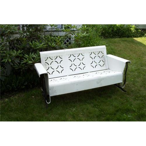 The glider is made of metal, and it glides smoothly. It has a great cut out floral motif on the back of the seat, and is very, very nice. It has that late Deco look about it, even though I am certain it was made after the Deco period. It measures 67 inches across and approximately 27 inches deep.