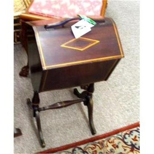 This is a really nice inlaid mahogany sewing stand or cabinet with gold painted trim. Both lids are hinged to open and there is a wood tray inside for your small sewing items. It is about 26" tall, the lids are about 13" long and the length of the legs is about 11 1/2" . It is in excellent condition with no damage. I am guessing it is probably from the 1930s-40s.