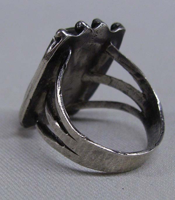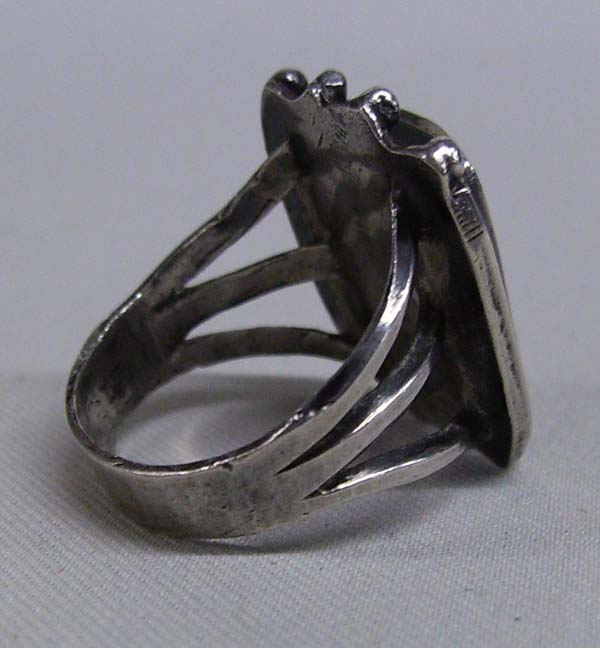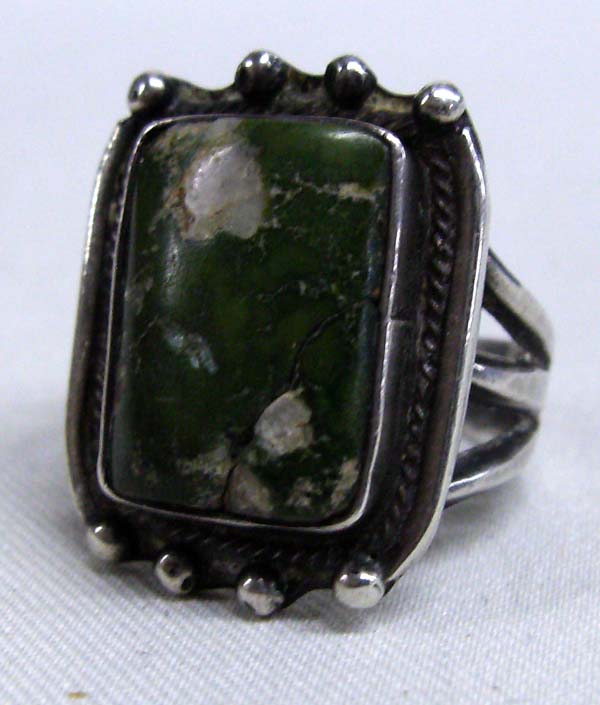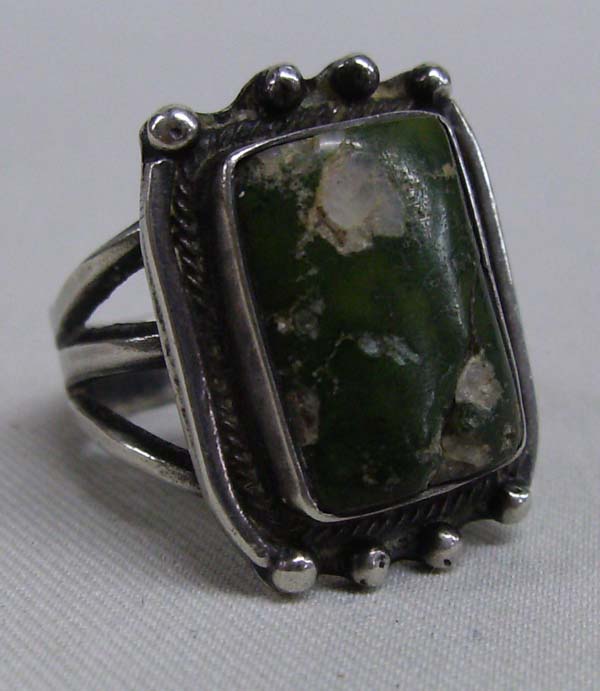 1930s-40s Native American Navajo Green Turquoise Ring. Sterling silver. The turquoise has a crack and two small chips on the white portions. Size 7.75. Cabochon is 1''x.75''. Buyers Pay Actual Shipping and Handling Charges(see terms and conditions for more information).