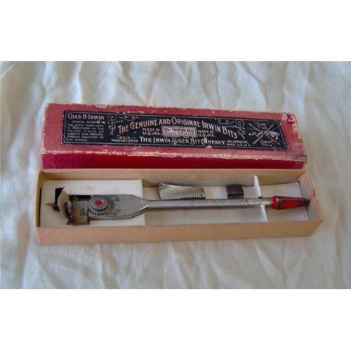 This tool comes from the Irwin Augur Bit Company, which operated from its founding by Charles Irwin in 1884 until 2003 in Wilmington, Ohio, when, as The Irwin Tool Company, it merged with American Tool Companies, Inc. (formerly Petersen Manufacturing) to become the Irwin Industrial Tool Company. It is an 8 1/2-inch long bore with two bits, one which is 1/2-inch and one which is 1 3/4-inch. All are in good condition in the original box. The label on the box attests to the age and vintage of this item, which is circa late 1930s to the early 1940s.