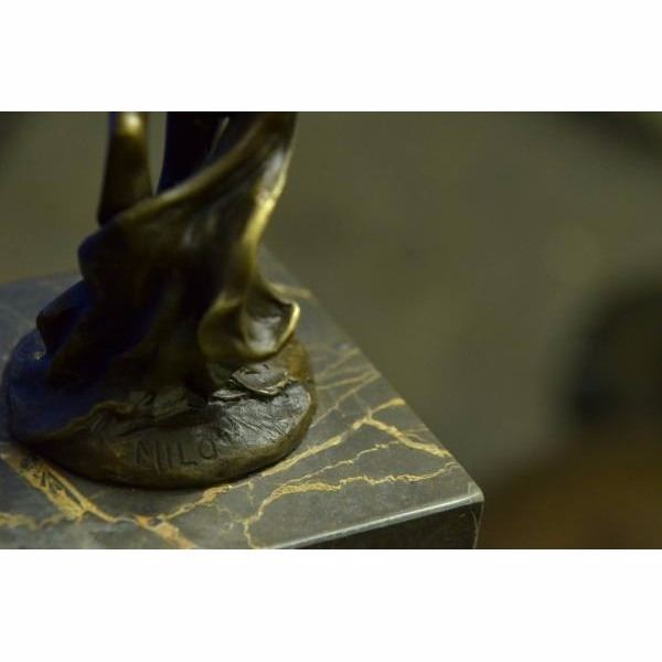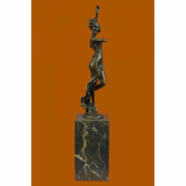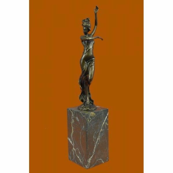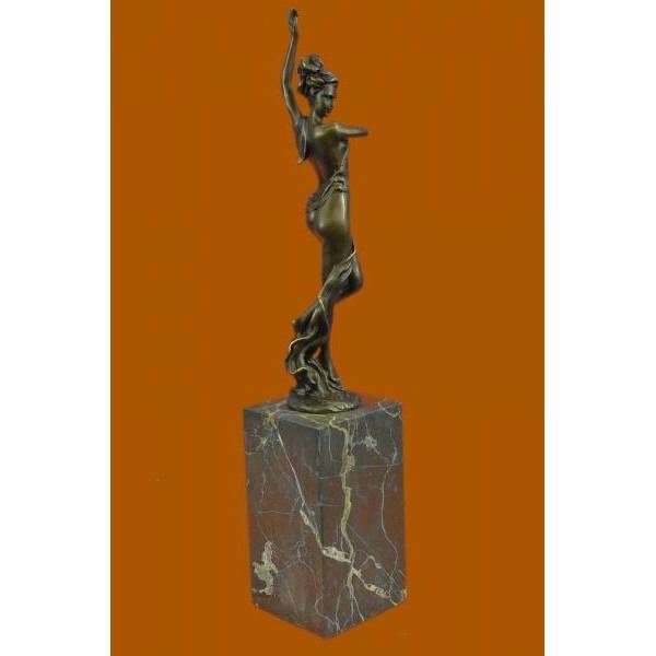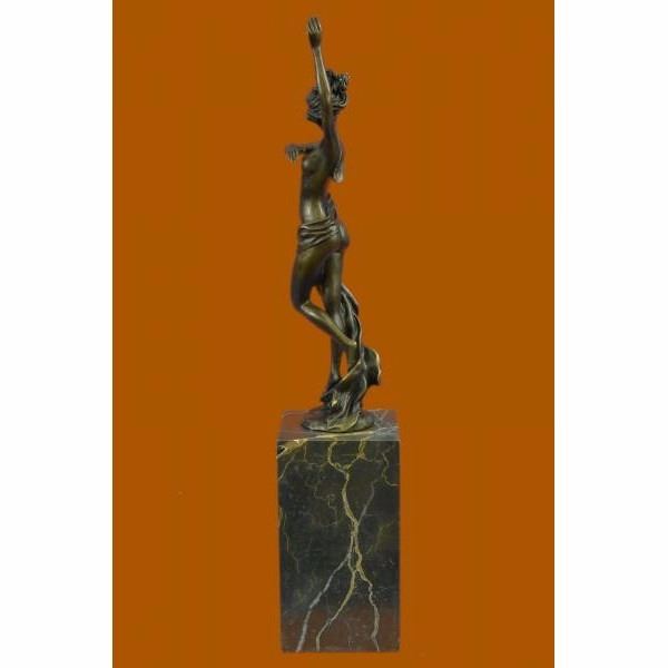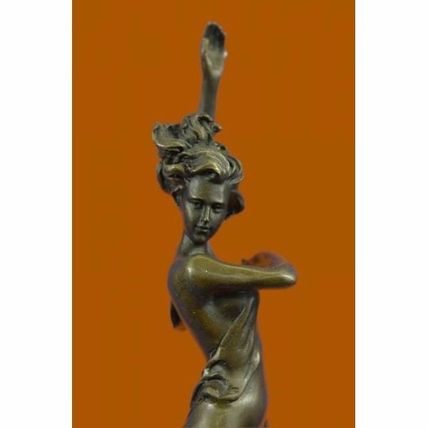 Sexy, proud and 100% confident, this beauty bares it all. She is no waif by any means, with round hips, curvy thighs and full breast. She combs her fingers through her long hair and lets the strands slide through her grasp. She is serene and carefree as the wind brushes against her brown patina skin. Cast using the "Lost Wax Method", this sculpture is 100% bronze and handmade. She is mounted on a brown marble base and signed by artist Milo. Condition : This sculpture is in perfect condition. Bronze Dimensions with Marble Base:Height 14.5" x Width 3" Marble Dimensions: 3" x 3". Height without base: 9.5" Weight : 6 LBS Inventory; 53-EP8282835
