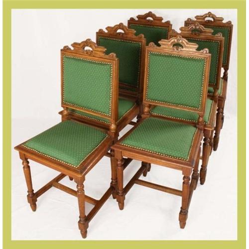 Belgian Set of 6 Oak Mechelen Chairs. Newly re-upholstered in classic green and gold fabric. Please refer to photos or contact us for further information. At EuroLux, our customer's happiness is our top priority. For this reason, we go to great lengths to fully, honestly and accurately describe our pieces. As we hand-select all of our pieces personally, we only buy high-quality items. However, please keep in mind that there is no such thing as a new antique or vintage item, and normal wear associated with these items is to be expected.