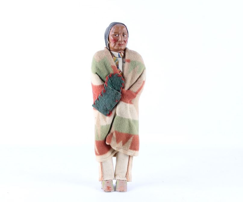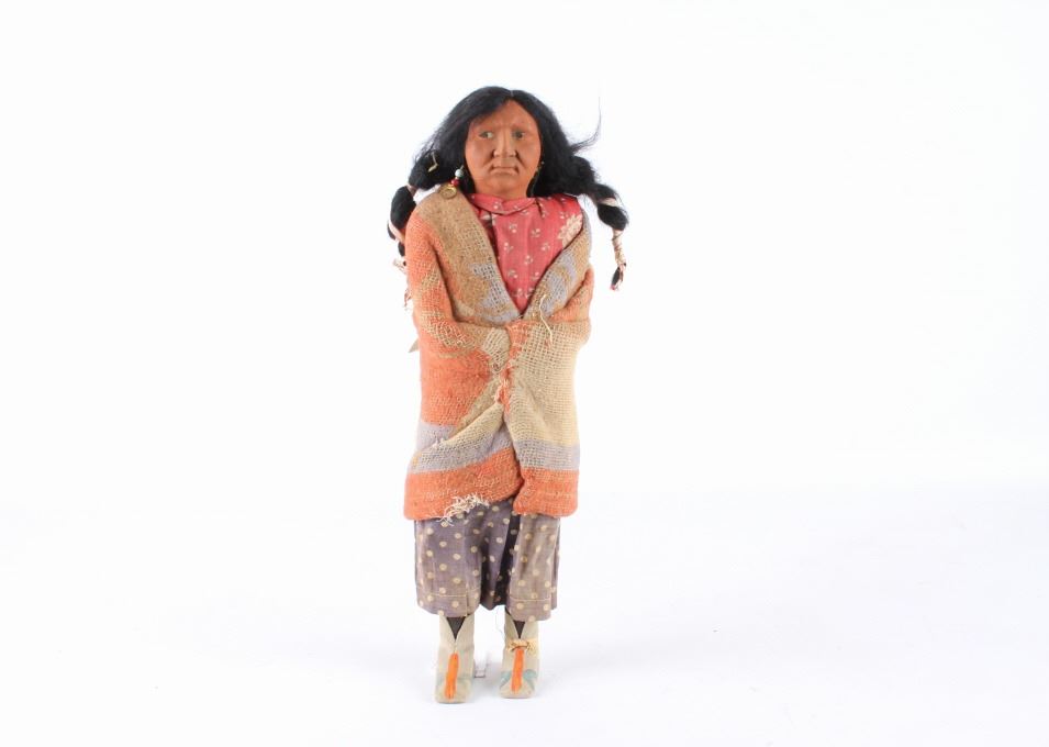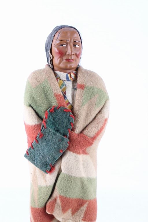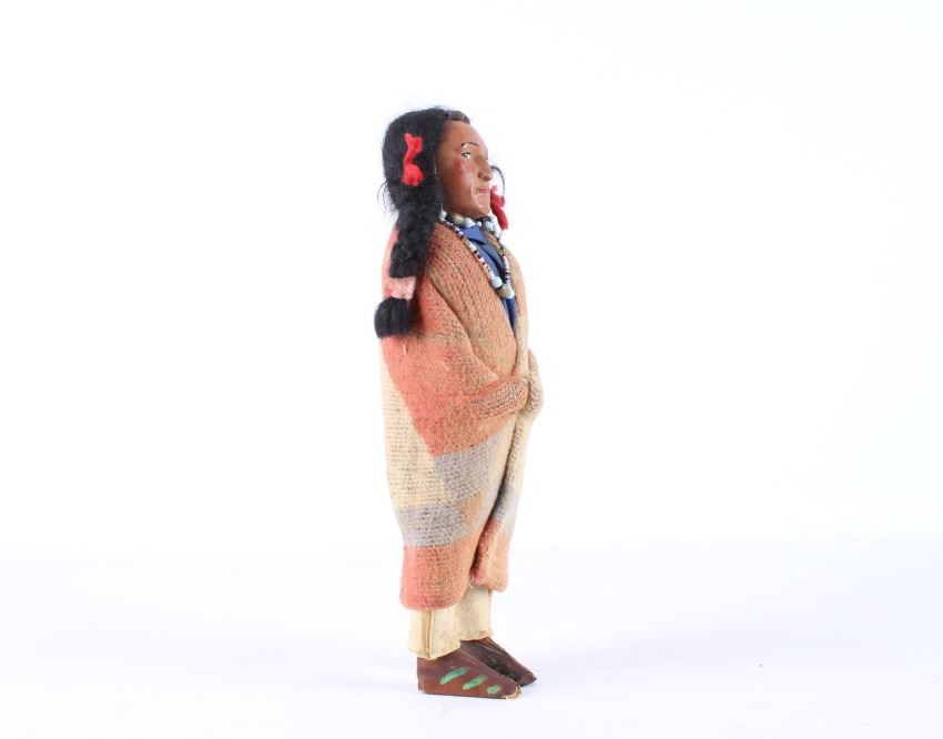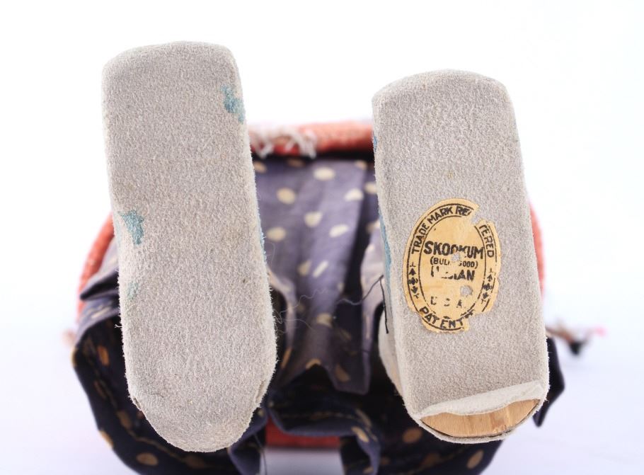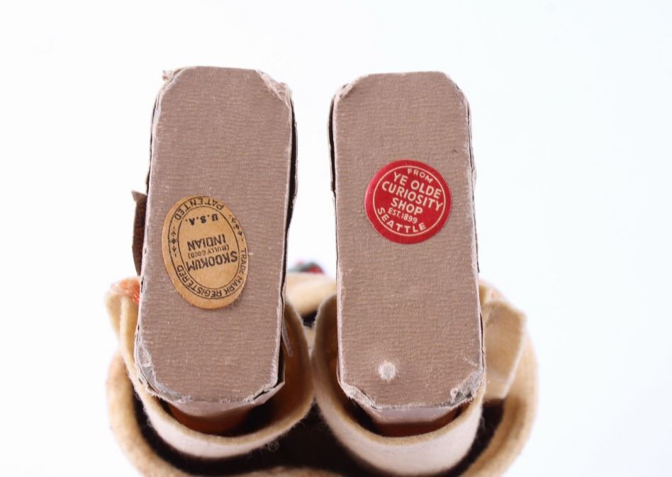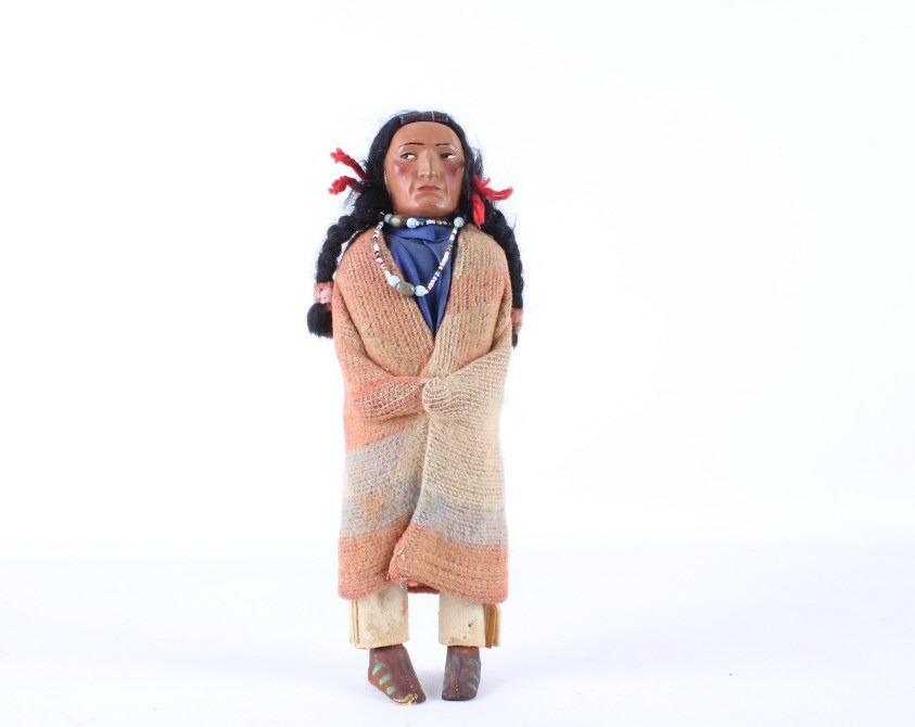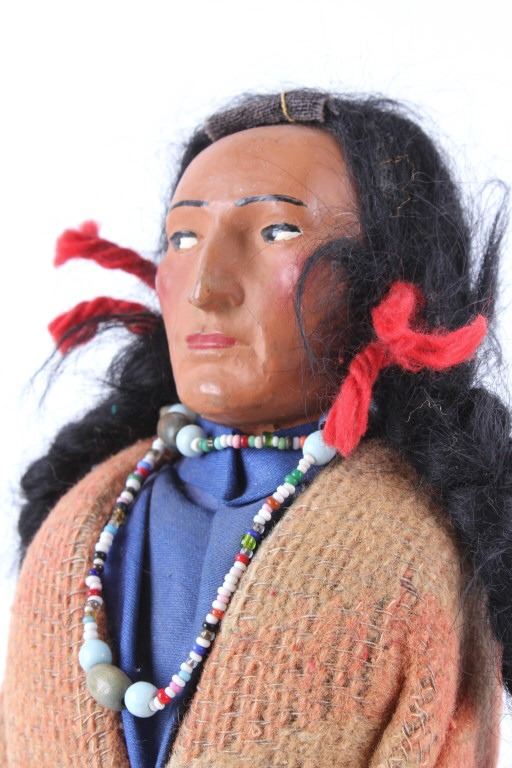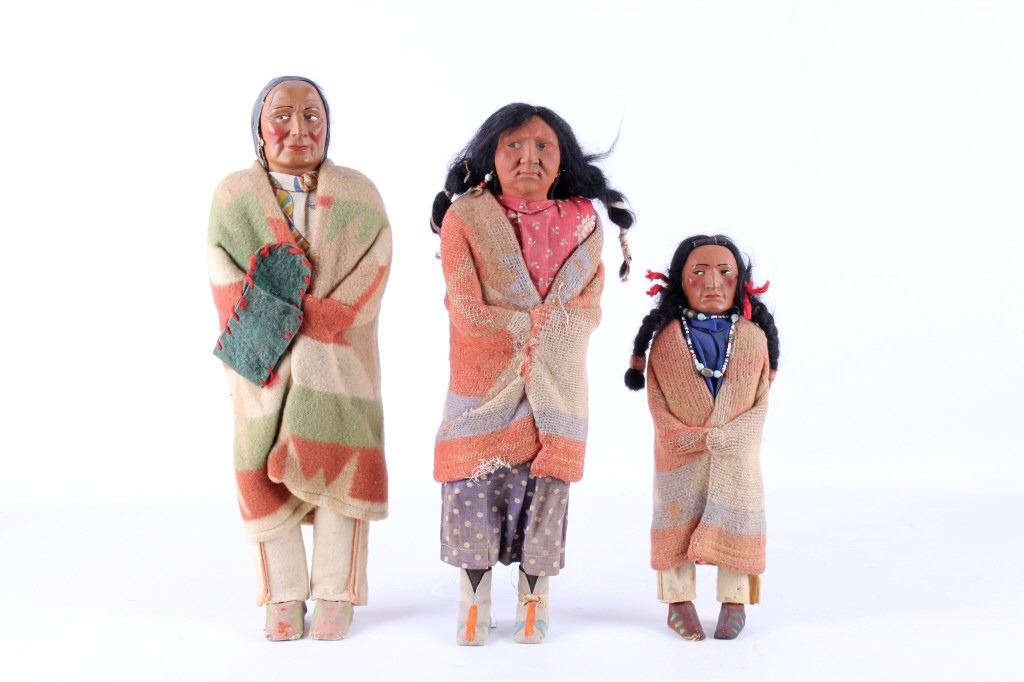 For your consideration in this lot is an early Native American "Skookum (Bully Good) Indian" doll collection of three. These dolls were mainly produced from 1914 until 1962, these particular Skookum Dolls are circa 1930's. The two taller Native American dolls hav a paper trademark sticker stating; "Trade Mark Registered - Patented - Skookum (Bully Good) Indian - U.S.A.". The dolls are also adorned with a beautiful woolen blanket, and traditional style accent features inlcuding hair braids, jewelery, and carrying pouch. The dolls are in overall good condition. The two taller pieces measure approximately 16" tall,and the shorter doll measures 12" tall.