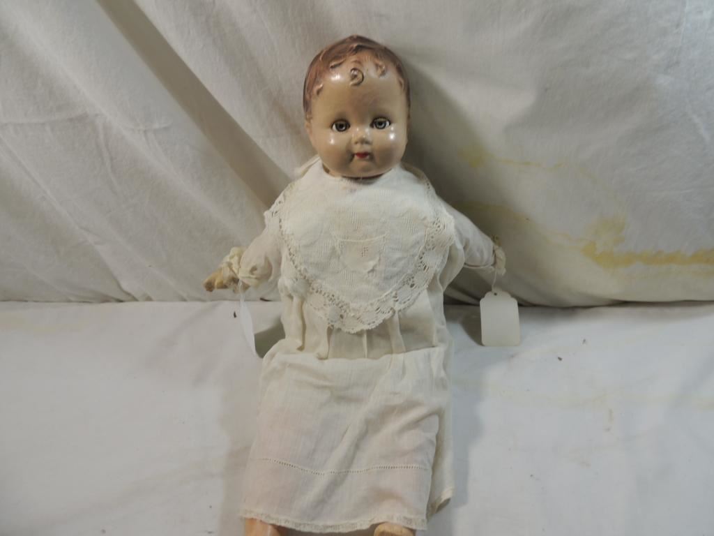 FACE HAS BEEN RESTORED EXCELLENT TIN EYES VINTAGE OUTFIT UNMAKRED NICE MOLDED HAIR 20" DOLL AS SHOWN SEE PHOTO FOR MORE DETAILS.