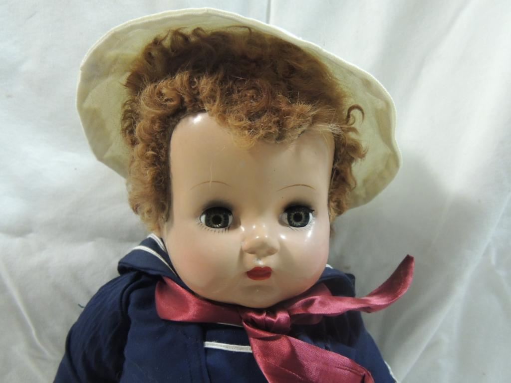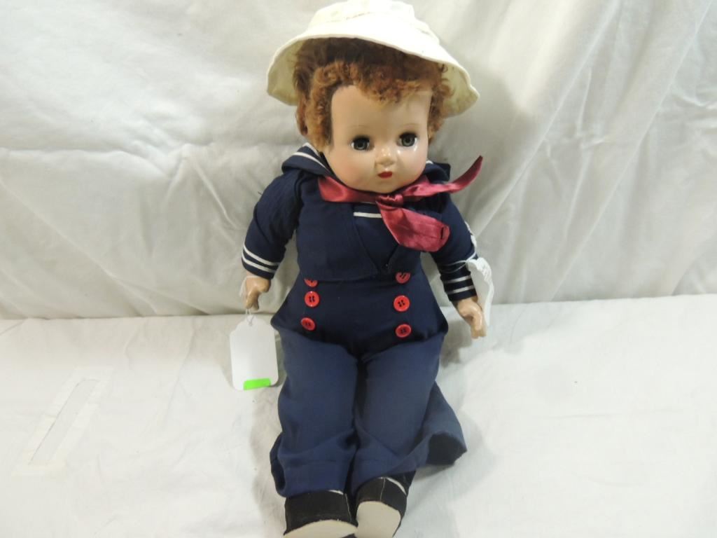 CARACUL HAIR, SLEEP EYES, CUTE SAILER OUTFIT, VINTAGE DOLL, COLLECTIBLE DOLL, AS SHOWN SEE PHOTO FOR MORE DETAILS.
