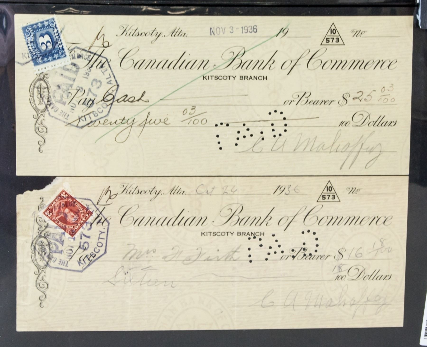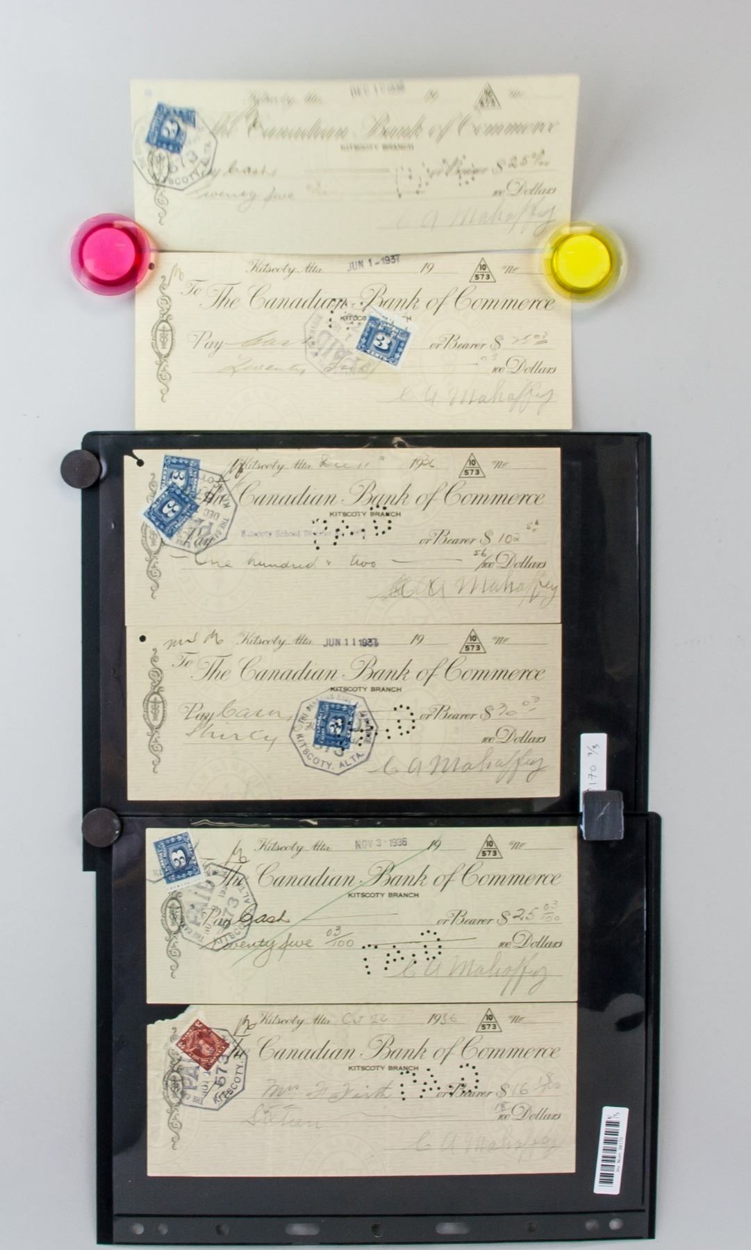 1930's Canadian Bank of Commerce Cancelled Cheques, Alberta, 8.6 x 21.2 cm