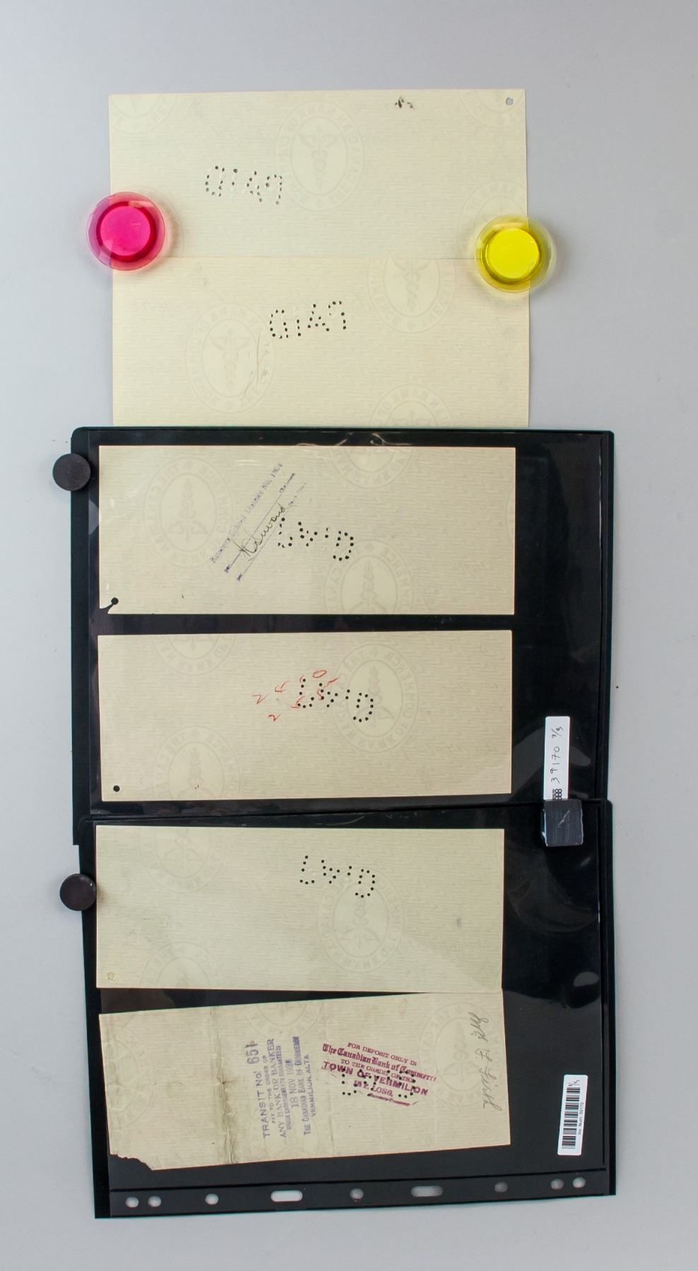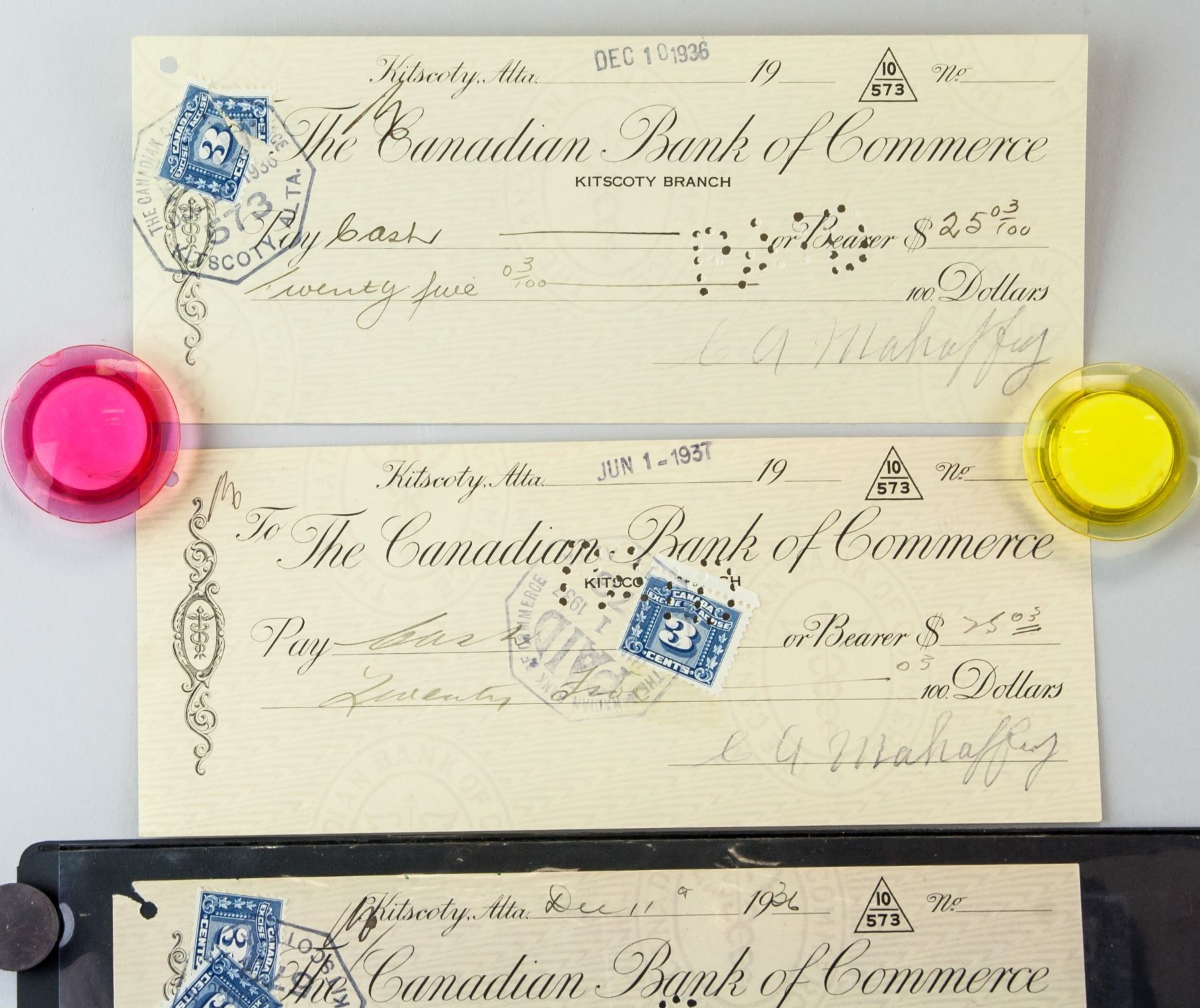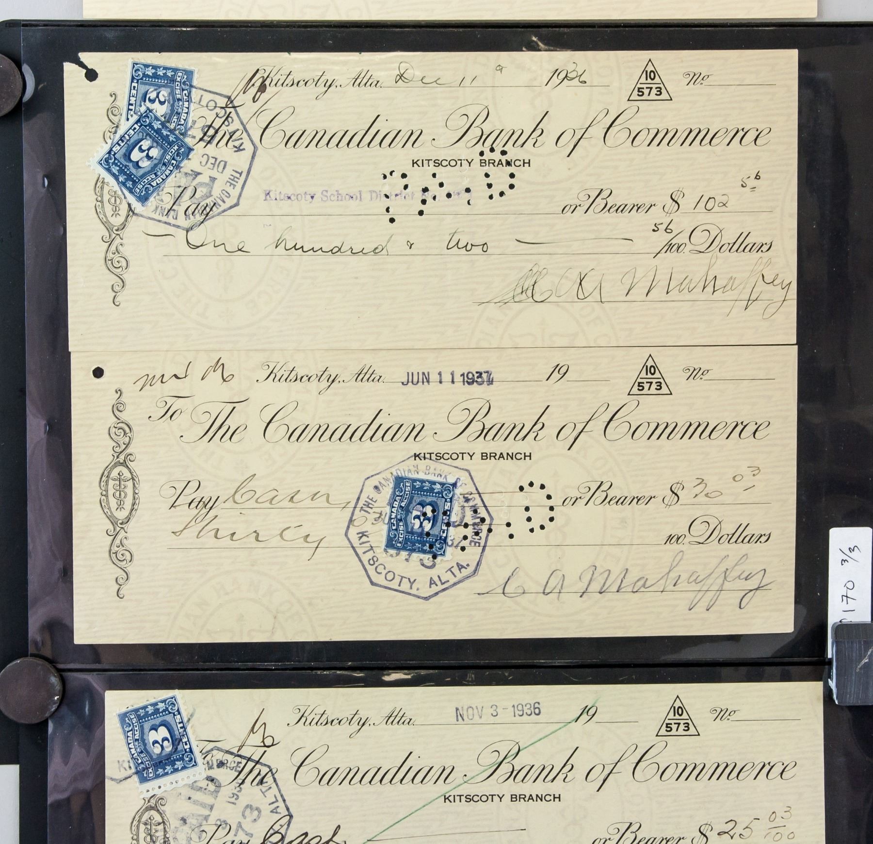 1930's Canadian Bank of Commerce Cancelled Cheques, Alberta, 8.6 x 21.2 cm