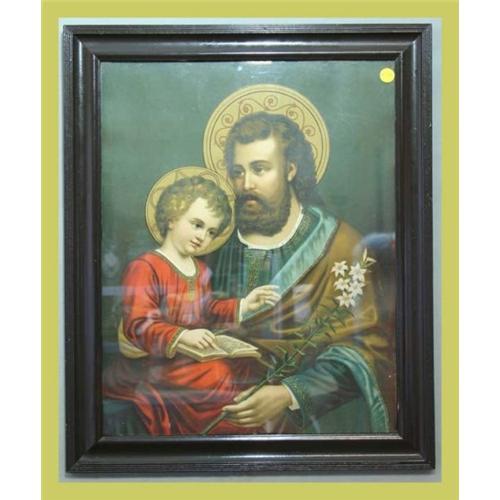 French Framed Color Lithograph of Jesus & Joseph. Colors are vibrant! Frame may have been painted, but this does not affect the beauty of the piece. Please refer to photos or contact us for further information. At EuroLux, our customer's happiness is our top priority. For this reason, we go to great lengths to fully, honestly and accurately describe our pieces. As we hand-select all of our pieces personally, we only buy high-quality items. However, please keep in mind that there is no such thing as a new antique or vintage item, and normal wear associated with these items is to be expected.