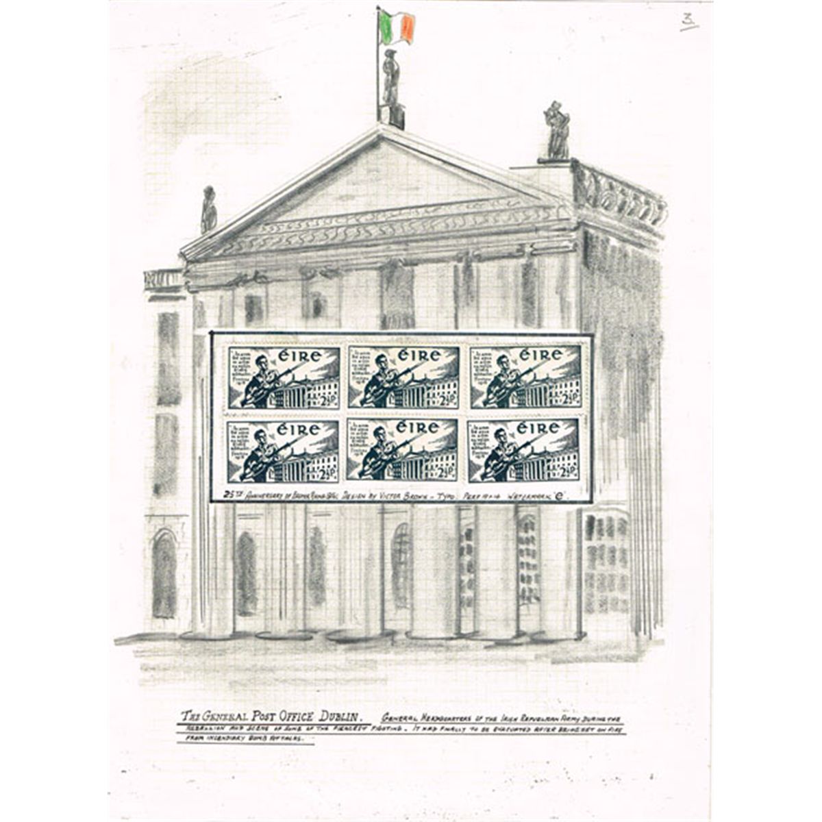 An old copy of the 1916 Proclamation, also with 1966 small copy of the Proclamation decorated with the coat of arms of each of the four provinces and pencil drawing of the GPO with six inset commemorative stamps issued in 1941. (3 items)