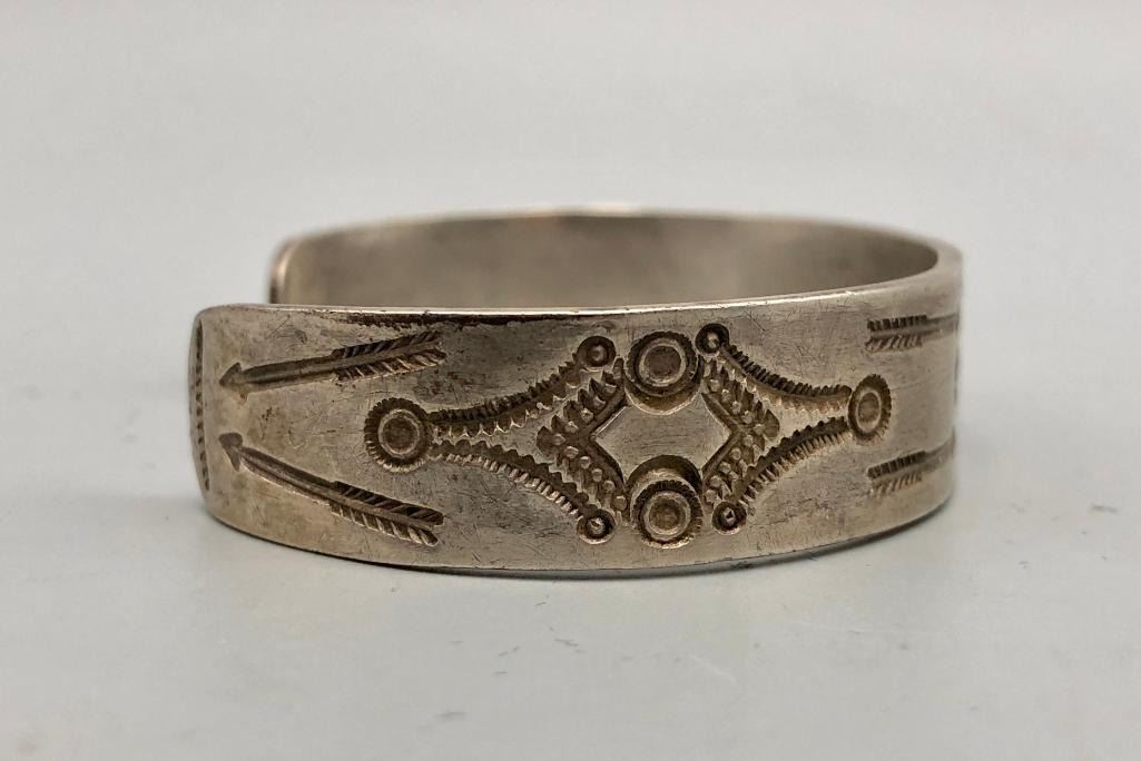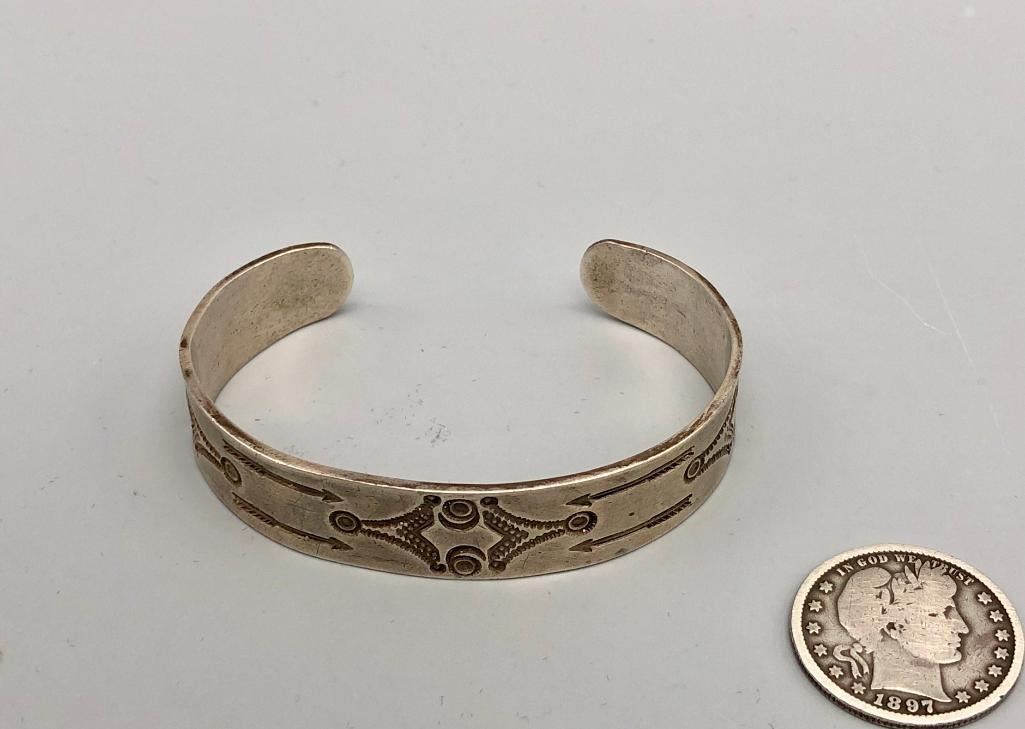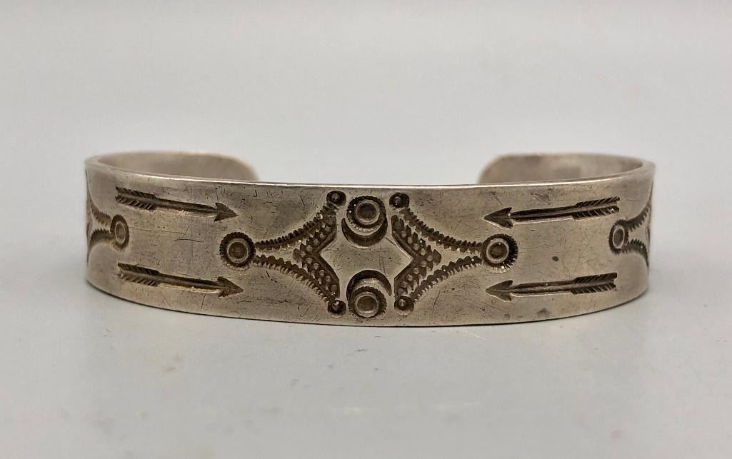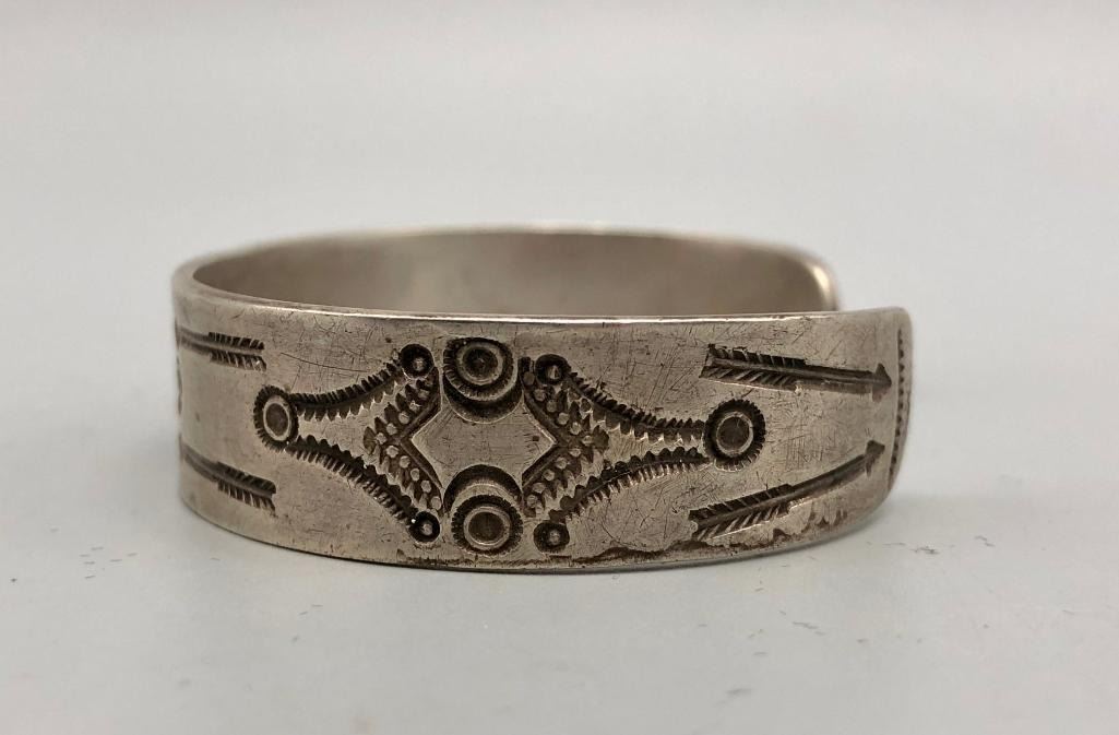For sale in this lot is a 1930s handmade silver bracelet with stamping. This is a neat old bracelet with great arrows and other hand stamped designs. It has a nice thick band that can be worn alone or stack with other pieces. It is made from sterling silver. MAKER: Unmarked. APPROX AGE: Circa 1930s. SIZE: Inside circumference measures 5-1/2 inches long. Opening is an additional 1-1/8 inches, fitting a 6-5/8 inch wrist. Width is 1/2 inches. Weighs 28.6 grams. CONDITION: Good for its age, normal wear expected. Please look closely at the pictures as they are an important part of our description and are hereby incorporated into the description, specifically with regards to condition. SHIPPING: There will be a $5 handling / packaging fee for shipping this lot. The actual cost of postage will be added on top of that. BUY IT NOW: If you would like to buy this item now, without waiting for the auction day to bid on it, we do offer this option (which is available up to 48 hours before the actual auction starts). The “Buy it Now†price is the high estimate of this lot (plus applicable fees and the Buyer's premium is discounted to 10% when using the Buy it Now option). If you would like to exercise this option, you must contact us by email (or phone as long as you talk to someone live). Reference this lot number and your intention to "Buy it Now."