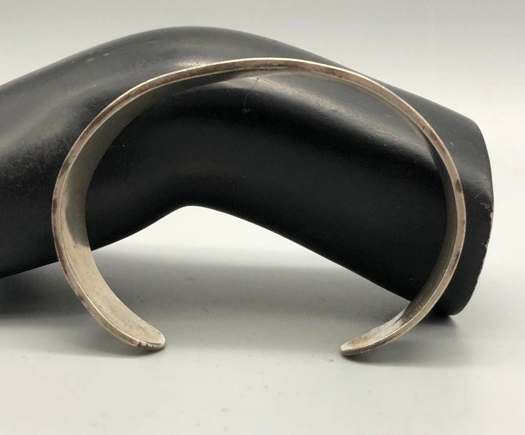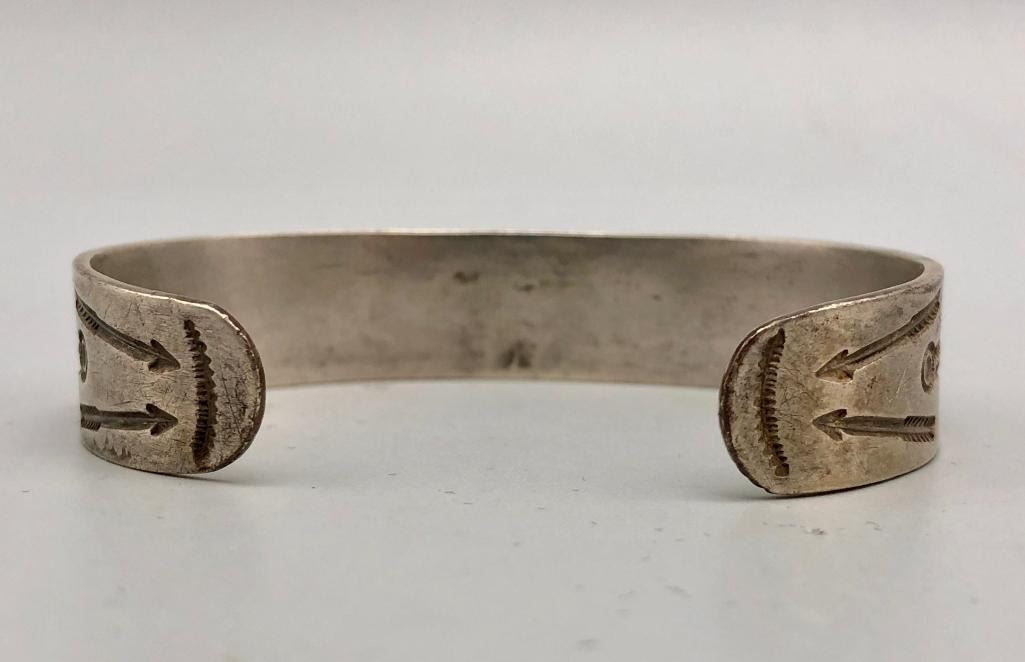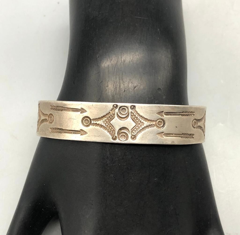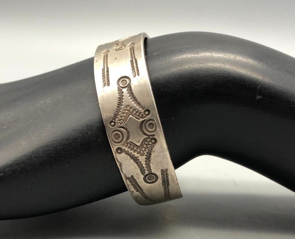 For sale in this lot is a 1930s handmade silver bracelet with stamping. This is a neat old bracelet with great arrows and other hand stamped designs. It has a nice thick band that can be worn alone or stack with other pieces. It is made from sterling silver. MAKER: Unmarked. APPROX AGE: Circa 1930s. SIZE: Inside circumference measures 5-1/2 inches long. Opening is an additional 1-1/8 inches, fitting a 6-5/8 inch wrist. Width is 1/2 inches. Weighs 28.6 grams. CONDITION: Good for its age, normal wear expected. Please look closely at the pictures as they are an important part of our description and are hereby incorporated into the description, specifically with regards to condition. SHIPPING: There will be a $5 handling / packaging fee for shipping this lot. The actual cost of postage will be added on top of that. BUY IT NOW: If you would like to buy this item now, without waiting for the auction day to bid on it, we do offer this option (which is available up to 48 hours before the actual auction starts). The “Buy it Now†price is the high estimate of this lot (plus applicable fees and the Buyer's premium is discounted to 10% when using the Buy it Now option). If you would like to exercise this option, you must contact us by email (or phone as long as you talk to someone live). Reference this lot number and your intention to "Buy it Now."