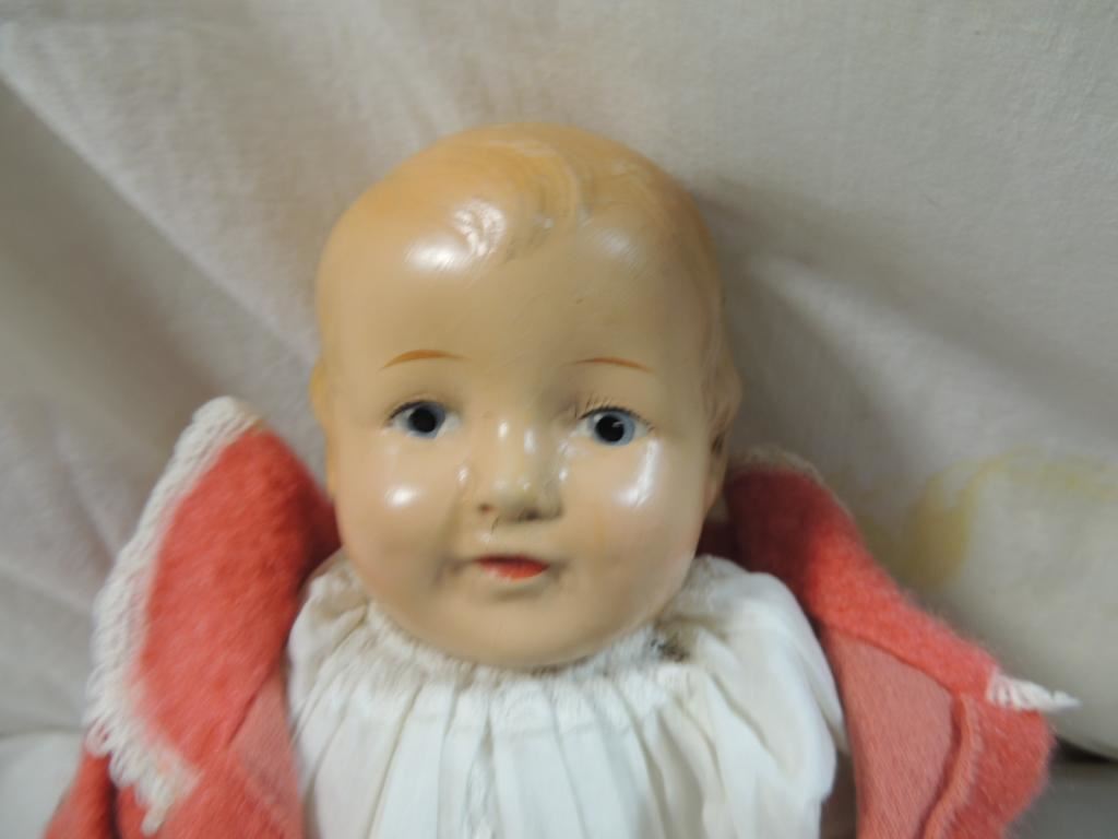 1930s 14" COMPOSITION DOLL MARKED E.I.H HORSMAN VINTAGE CLOTHING PAINTED FACE MOLDED HAIR. AS SHOWN SEE PHOTO FOR MORE DETAILS.