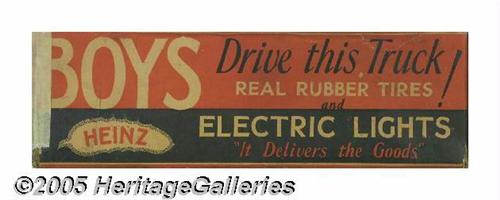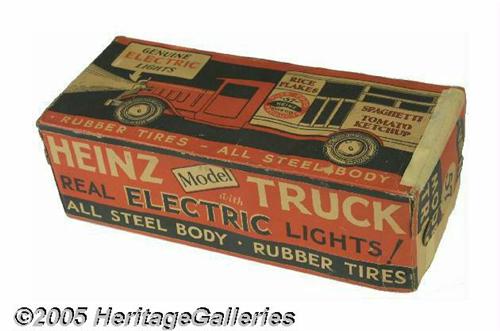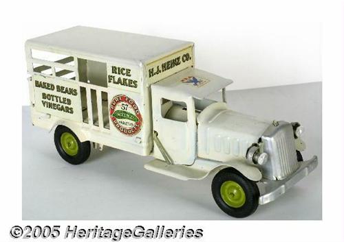 <B>1930s Metalcraft Heinz Delivery Truck Complete With Box</B></I> "Boys - Drive this Truck!" All Steel Body. Real Rubber Tires and Electric Lights. It Delivers the Goods" shouts the printed copy on this truck's original box. We can just imagine the thrill this toy model truck probably brought its first owner, with Electric Lights, how cool was that in the 1930s! Just think of the thrill it will now bring the highest bidder and that could be you. This is an all-original old heavy gauge pressed steel delivery truck with its original white paint, with an opening tailgate, rolling black rubber tires with the original bright green hubs and electric headlights (not tested). All the decals are intact and readable, no dents and only extremely minor paint chipping here and there. This toy was only lightly played with; you likely won't find a nicer one. The graphic box is present and is approximately ninety percent complete. What a great item for that inner child. Isn't that what motivates most toy collectors? Lot:252