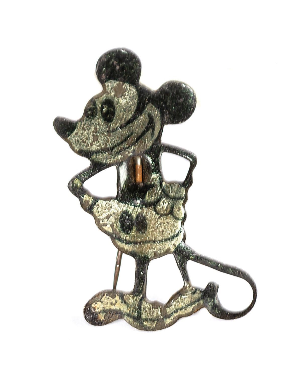 (Disney, 1930s) A very rare early pin depicting Mickey Mouse. The German-made pin is composed of die-cut tin with black and silver details that depict Mickey in his "hands-on-hips" pose. The bent nail-style pin on the reverse and tail are still attached. Mickey measures 1.25" tall and is in good used condition with some surface tarnishing from age.