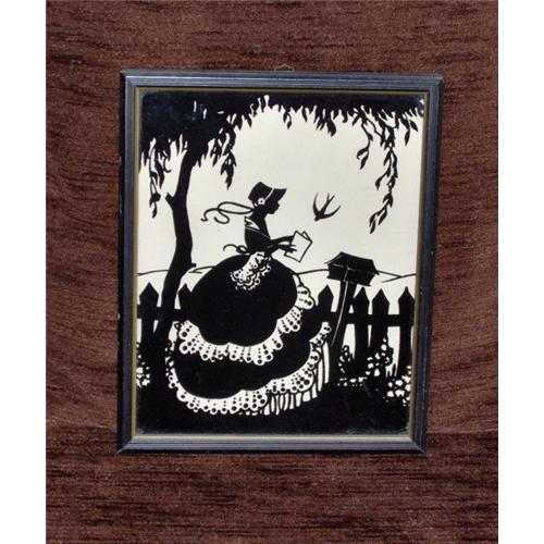 This reverse-painted silhouette shows a rococo-style image of a lady answering her mail--no doubt a letter from her beau. She stands, a swaying doll-like figure, under a willow tree next to a picket fence and a verdant field while a swallow swoops down to read the letter with her. It captures our imagination as well as takes us back in history to that time.<p>
