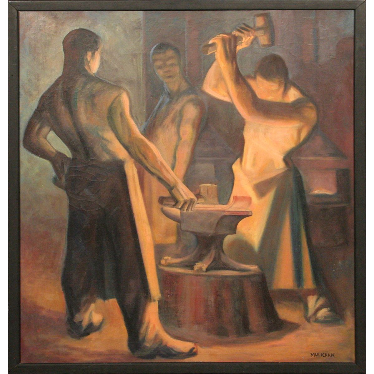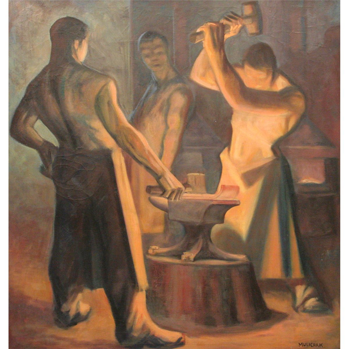 1930s WPA Painting Signed Mulichak. Iron Workers. 36" x 32" oil on canvas. Signed lower right: MULICHAK.