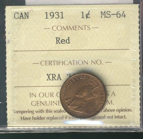 1931 1¢ ICCS MS64RD. 80% wine red with strong lustre.