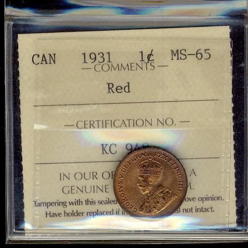 1931 1¢ ICCS MS65RD. Outstanding flawless obverse. 80% red. ICCS Top 7.
