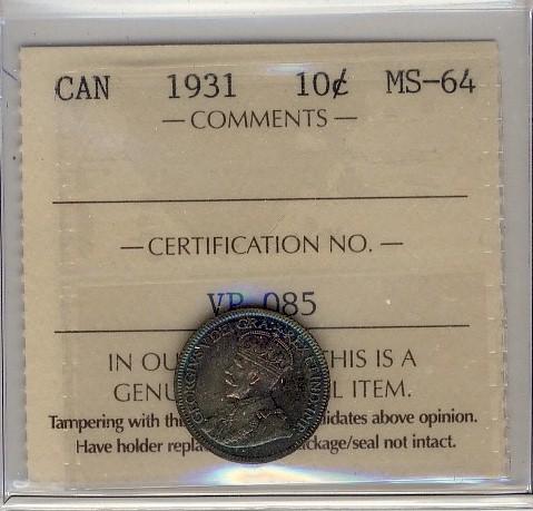 1931 10¢ ICCS MS64. Lovely example with bluish tone.