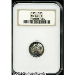 <B>1931<10C> MS65 Full Bands NGC.</B></I> Fully struck with appealing sea-green iridescence near the peripheries, and deep purple-brown color in the fields. A beautifully toned, exquisitely preserved Gem.<BR><I>From The Reed Hawn Collection of Mercury Dimes.</B></I> <BR><BR><B>Important notice:</B> Heritage usually auctions material at the rate of 200-250 lots per hour. On some occasions eBay Live bid software or the Internet may not be able to keep up with the pace of the auction. We recommend placing a realistic absentee bid now as insurance to avoid disappointment. Occasionally the auctioneer may eliminate or reject an eBay Live bid, and the auctioneer may also reopen a lot after the close of the eBay live bidding (usually because we missed an audience bid), and may reject your bid even if it shows you as the winning bidder. By bidding via eBay Live, you agree that Heritage may award the lot to another bidder at its sole discretion under the circumstances described above or any other reasonable circumstances. Since eBay bids are not shown to us until we open the lot on the floor, we treat those bids just like floor bids. In most cases the floor responds before the eBay bid is presented to us, due to Internet lag time, so for consistency we have made it a policy that floor bids are always considered first over tie eBay live bids. Also please note that all Heritage lots purchased through eBay Live carry a 20% Buyer's Premium. Please make sure you read the Terms and Conditions before you bid. </span></font></tr></table></td></tr></table>