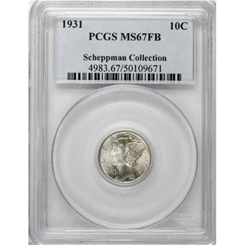 <B>1931 10C MS67 Full Bands PCGS.</B></I> Powerfully struck with a subtle melange of sky-blue, lavender, and golden-tan toning that drapes strongly lustrous fields and exquisitely detailed devices. Magnificently preserved with overwhelming eye appeal. NGC has graded no Full Bands Superb Gems, while the PCGS <I>Population Report</B></I> shows just 10 such pieces, with none finer (12/07).<BR><I>From The Scheppman Collection, #4 PCGS Registry of Full Band Mercury Dimes.</B></I><BR><BR><B>Coin Engraver:</B> Adolph A. Weinman<BR><BR><b>Shipping:</b> Coins & Currency (<a target="_blank" href="http://www.heritageauctions.com/common/shipping.php">view shipping information</a>)
