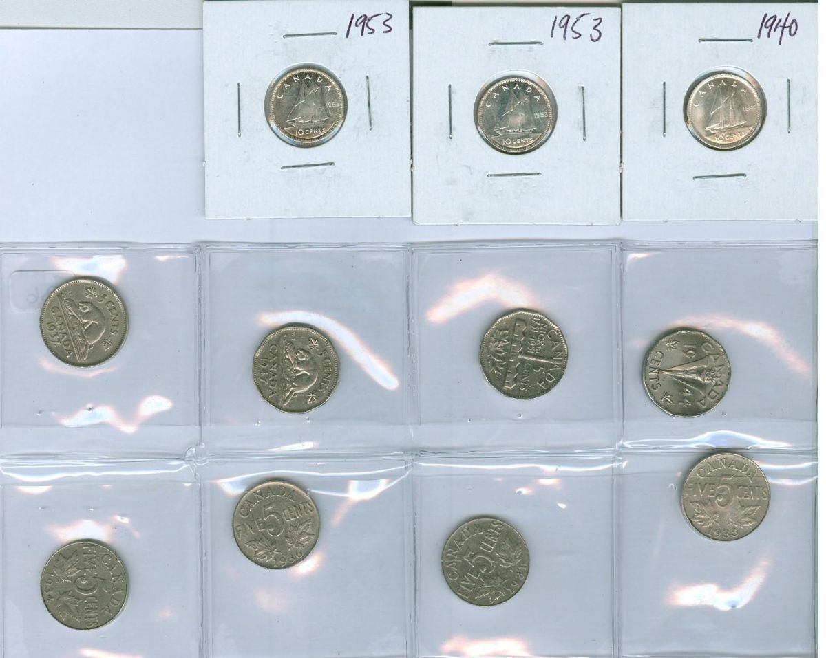 1931-1951 5¢ and 1940, 1953(2) 10¢. Lot of 11 coins, includ