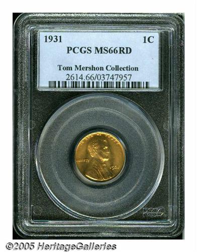 <B>1931<1C> MS66 Red PCGS.</B></I> A lustrous and nicely struck Gem that has exquisite surfaces and gorgeous orange-rose color. Some light carbon flecking is seen on each side.<BR><I>From The Tom Mershon #2 All-Time PCGS Registry Set of Lincoln Wheat Cents.</B></I>