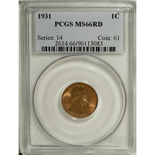 <B>1931 1C MS66 Red PCGS.</B></I> PCGS Population (238/11). NGC Census: (182/22). Mintage: 19,396,000. Numismedia Wsl. Price for NGC/PCGS coin in MS66: $590. (#2614)<BR><BR><b>Shipping:</b> Coins & Currency (<a target="_blank" href="http://www.heritageauctions.com/common/shipping.php">view shipping information</a>)