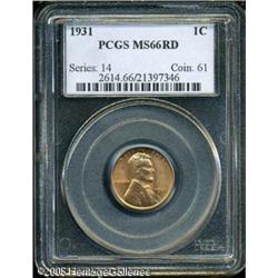 <B>1931 1C MS66 Red PCGS.</B></I> Sharply defined with full mint red color. Just a few small carbon flecks are noted on each side that limit the already high grade. Lot:5518