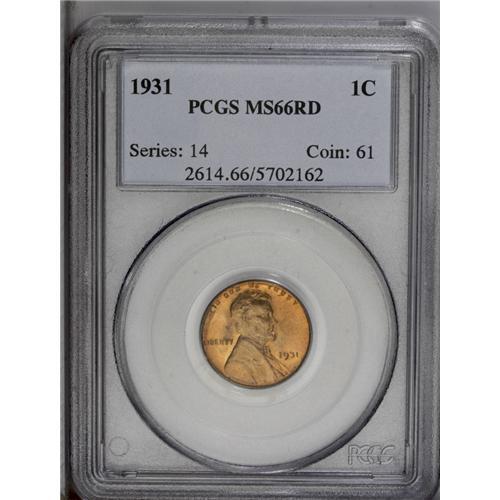 <B>1931<1C> MS66 Red PCGS.</B></I> Well made with lustrous orange-red surfaces which are amazingly smooth. Some minor spotting is seen on the reverse. There is one small contact mark on the obverse near Lincoln's chin. Only 10 examples are known to be finer at PCGS (7/06).<BR><I>From The Tigard Oregon Small Cent Collection.</B></I>