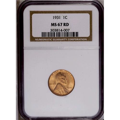 <B>1931<1C> MS67 Red NGC.</B></I> The Philadelphia Mint coined more than 19 million cents in 1931. Lincoln cent authority David Lange (1996) writes that survivors in all grades up through Fine are quite available, but become difficult in VF through AU. Mint State coins can be had through the MS66 grade level, though examples with fully red color may require a little more searching. In Superb Gem Red, the level of preservation of the specimen offered here, the 1931 cent becomes a challenge. The highly lustrous surfaces display attractive orange color and sharply struck devices. There are no significant abrasions to report. A handful of light toning spots are seen in the upper reverse field. Census: 12 in 67, 0 finer (2/06).