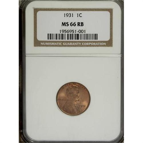 <B>1931 1C MS66 Red and Brown NGC.</B></I> NGC Census: (11/1). PCGS Population (5/0). Mintage: 19,396,000. Numismedia Wsl. Price for NGC/PCGS coin in MS66: $100. (#2613)<BR><BR><B>Coin Engraver:</B> Victor D. Brenner<BR><BR><b>Shipping:</b> Coins & Currency (<a target="_blank" href="http://www.heritageauctions.com/common/shipping.php">view shipping information</a>)