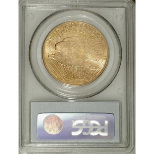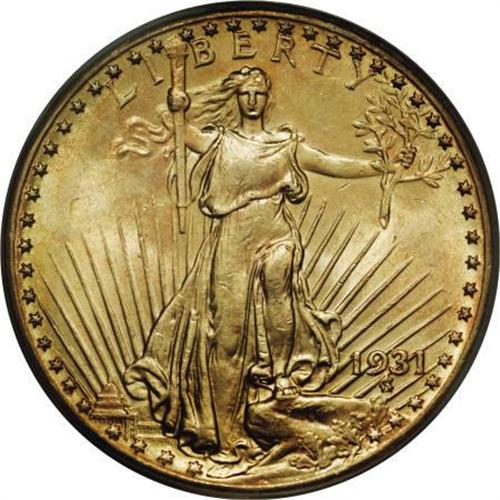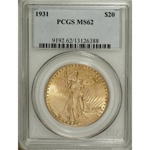 <B>1931 $20 MS62 PCGS.</B></I> Many numismatic scholars have written about the apparent folly of the government's extensive gold mintages in the late 1920s and early 1930s. Taken out of context, the numbers seem absurd; why should Philadelphia have struck over 2.9 million double eagles in 1931, for example, only to have most of them melted two years later? At the time, however, few perceived the long-term nature of what later historians would term the Great Depression.<BR> Indeed, Herbert Hoover acted swiftly to counteract some of the effects of the worsening economy, and by early 1930, there were a number of promising signs. From documents archived in John Woolley and Gerhard Peters' <I>The American Presidency Project</B></I> and stored on the University of California - Santa Barbara Web side, Hoover related in a January 21, 1930 news conference, "The Department of Labor reports this morning that for the first time since the stock exchange crash the tide of employment is changed in the right direction--shows a very distinct increase in employment all over the country during the past 10 days."<BR> If the economy had turned around and international commerce experienced a resurgence, the over 2.9 million double eagles struck at Philadelphia in 1931 would have entered banking channels. As it turned out, both Hoover and the nation experienced declining fortunes, and the elections of 1932 brought Franklin Delano Roosevelt to the presidency. The actions of the new Chief Executive brought about the mass melting that has left numerous paradoxes in the final years of America's non-commemorative gold coinage.<BR> The peach-inflected apricot-gold surfaces of this enticing survivor offer excellent luster, and the overall detail is crisp. The obverse is surprisingly mark-free for the grade assigned, though the reverse shows a number of light to moderate abrasions. Still, this is a highly desirable late-date Saint-Gaudens double eagle that displays beautifully. It represents an excellent opportunity for the interested collector.<BR><I>From The Chicago Collection of Saints.</B></I><BR><BR><B>Coin Engraver:</B> Augustus Saint-Gaudens<BR><BR><b>Shipping:</b> Coins & Currency (<a target="_blank" href="http://www.heritageauctions.com/common/shipping.php">view shipping information</a>)