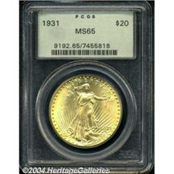 <table><tbody><tr><td><table> <TR><TD width="100%"><TABLE cellSpacing=1 cellPadding=3 width="100%" border=0><TBODY><TR><TD width="100%" bgColor=#79735c><FONT face=arial color=#ffffff size=3><B>Description</B> </FONT></TD></TR><TR><TD width="100%" bgColor=#ffffff><FONT face=arial size=2><B>1931 $20 MS65 PCGS.</B></I> Among Saint-Gaudens Double Eagles, the 1931 is considered to be one of the top seven rarest issues in the series, with precious few examples that survived the mass meltings of Twenty Dollar gold pieces minted in the now elusive years of 1929 to 1933. The original mintage of 2,938,250 pieces was apparently almost obliterated by the gold recall of 1933. Experts have speculated over the years which of these later dated issues is now the rarest, and exactly how they should be ranked. The population figures by the major services can sometimes be misleading as to exact rarity, as the same coin may have been submitted to both services at different times, or even the same service multiple times thus causing the published figures to be inflated. As a Gem, however, it seems clear that the 1931 falls into the lower echelon of these rarities.<BR>The splendidly original Gem offered here is the nicest 1931 we have offered since a similarly certified piece realized $30,475 in our 2000 Central States Sale. Soft frosted, original luster is evident over both sides and only a few modest luster grazes are visible here and there, most either in the fields or buried within the eagle's feathers. Hints of olive patina are noticed at the borders. An important opportunity for the serious collector of Saint-Gaudens Double Eagles. Population: 25 in 65, 5 finer (10/03). </FONT></TD></TR></TBODY></TABLE></TD></TR></TBODY></TABLE><BR><A name=PricesRealized></A><TABLE cellSpacing=0 cellPadding=0 width="100%" bgColor=#000000 border=0><TBODY><TR><TD width="100%"><TABLE cellSpacing=1 cellPadding=3 width="100%" border=0><TBODY><TR><TD width="100%" bgColor=#79735c><A name=PR><FONT face=arial color=#ffffff size=3><B>Previous Prices from Heritage Auctions</B> </FONT></A></TD></TR><TR><TD bgColor=#f6f6ed><TABLE cellSpacing=0 cellPadding=0 width="100%" border=1><TBODY><TR><TD align=middle width="33%"><B>Date</B></TD><TD align=middle width="33%"><B>Service</B></TD><TD align=middle width="33%"><B>Price</B></TD></TR><TR bgColor=whitesmoke><TD width="33%"><B>01/07/2004</B></TD><TD width="33%">NGC</TD><TD width="33%">$49,450.00</TD></TR><TR bgColor=whitesmoke><TD width="33%"><B>05/05/2000</B></TD><TD width="33%">PCGS</TD><TD width="33%">$30,475.00</TD></TR><TR bgColor=whitesmoke><TD width="33%"><B>01/08/1999</B></TD><TD width="33%">PCGS</TD><TD width="33%">$41,630.00</TD></TR><TR bgColor=whitesmoke><TD width="33%"><B>02/16/2000</B></TD><TD width="33%">PCGS</TD><TD width="33%">$31,625.00</TD></TR><TR bgColor=whitesmoke><TD width="33%"><B>01/01/1990</B></TD><TD width="33%">PCGS</TD><TD width="33%">$77,000.00</TD></TR><TR bgColor=whitesmoke><TD width="33%"><B>02/01/1999</B></TD><TD width="33%">PCGS</TD><TD width="33%">$44,850.00</TD></TR><TR bgColor=whitesmoke><TD width="33%"><B>05/01/1999</B></TD><TD width="33%">PCGS</TD><TD width="33%">$32,775.00</TD></TR><TR bgColor=whitesmoke><TD width="33%"><B>05/01/1990</B></TD><TD width="33%">NGC</TD><TD width="33%">$75,350.00</TD></TR><TR bgColor=whitesmoke><TD width="33%"><B>05/01/1996</B></TD><TD width="33%">NGC</TD><TD width="33%">$40,700.00</TD></TR></TBODY></TABLE></TD></TR><TR><TD bgColor=#ffffff><FONT face=arial size=1 ?>PLEASE NOTE: All prices realized reflect the final hammer price PLUS the buyer's premium in auctions that charge a buyer's premium. Each item has a notation at the top of the listing indicating whether that lot included a buyer's premium. Example: A item that sells with a final hammer price of $100 and a 20% buyer's premium will display with a price realized of $120. All information listed is intended to be as accurate as possible, but errors are possible. Please use this guide carefully and inform us of any inaccuracies. </FONT></TD></TR></TBODY></TABLE></TD></TR></TBODY></TABLE><BR><TABLE cellSpacing=0 cellPadding=0 width="100%" bgColor=#000000 border=0><TBODY><TR><TD width="100%"><TABLE cellSpacing=1 cellPadding=3 width="100%" border=0><TBODY><TR><TD width="100%" bgColor=#79735c colSpan=6><FONT face=arial color=#ffffff size=3><B>Price Guide*</B> </FONT></TD></TR><TR bgColor=#f6f6ed><TD align=middle><B>Grade</B> </TD><TD align=middle><B>Coin World<BR>(Trends)</B> </TD><TD align=middle><B>Numismedia<BR>Retail</B> </TD><TD align=middle><B>Numismedia<BR>Wholesale</B> </TD><TD align=middle><B>Coin<BR>Universe</B> </TD><TD align=middle><B>Heritage<BR>Value Index</B> </TD></TR><TR bgColor=#ffffff><TD align=middle>64</TD><TD align=right>$40,000.00</TD><TD align=right>---</TD><TD align=right>$24,725.00</TD><TD align=right>$35,000.00</TD><TD align=right>$25,600.00</TD></TR><TR style="FONT-WEIGHT: bold" bgColor=#cccfdd><TD align=middle>65</TD><TD align=right>$50,000.00</TD><TD align=right>---</TD><TD align=right>$33,750.00</TD><TD align=right>$57,500.00</TD><TD align=right>$37,683.33</TD></TR><TR bgColor=#ffffff><TD align=middle>66</TD><TD align=right>$75,000.00</TD><TD align=right>---</TD><TD align=right>$77,500.00</TD><TD align=right>---</TD><TD align=right>$52,500.00</TD></TR><TR bgColor=#ffffff><TD colSpan=6><FONT size=1>*All information listed is intended to be as accurate as possible, but errors are possible. No item may be returned or refused based on this information which is provided as a service to our customers. You should contact each pricing source directly to determine the accuracy of this information. </FONT></TD></TR></TBODY></TABLE></TD></TR></TBODY></TABLE><BR><TABLE cellSpacing=0 cellPadding=0 width="100%" bgColor=#000000 border=0><TBODY><TR><TD width="100%"><TABLE cellSpacing=1 cellPadding=3 width="100%" border=0><TBODY><TR><TD width="100%" bgColor=#79735c><FONT face=arial color=#ffffff size=3><B>Population Guide</B> </FONT></TD></TR><TR bgColor=#