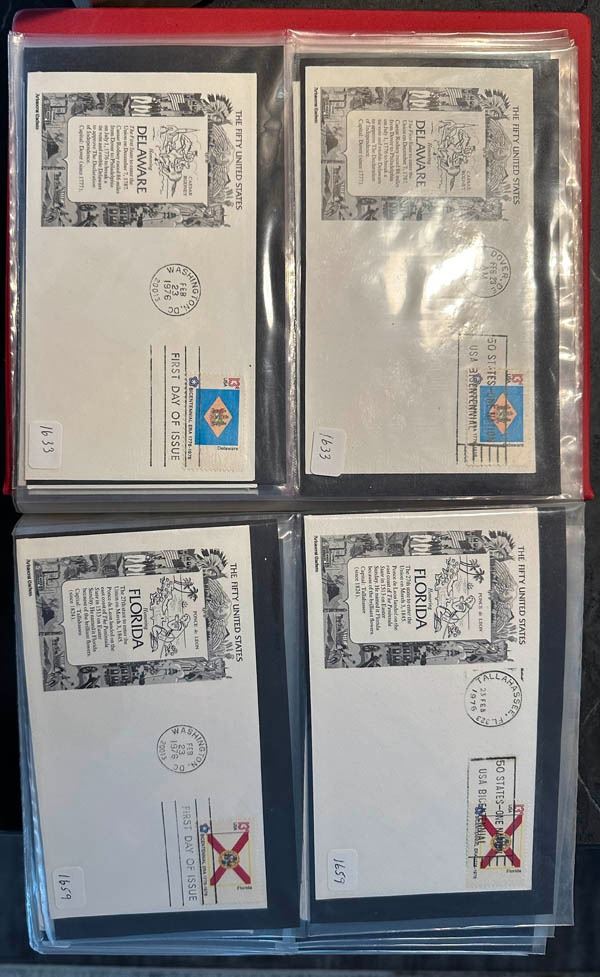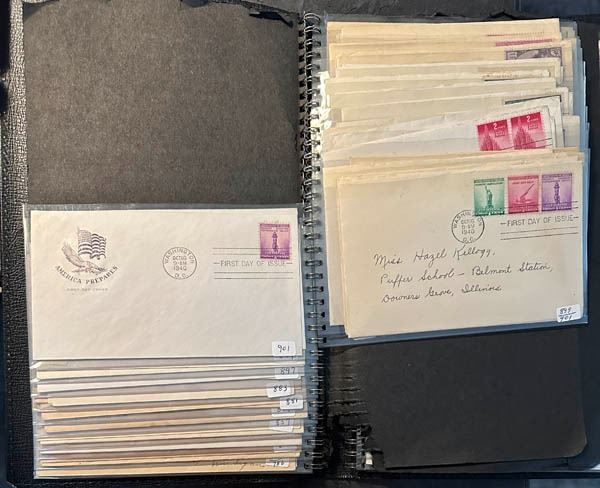 1931-2001, a large interesting FDC collection. Approximately 1800, including State Parks, Prexies (two of the $1), Famous Americans, Overrun Countries, Birds and Flowers, States, States and Airmail stamps and a few first flights. Some are even on the oversized envelopes. It appears this collector was attempting to get every commemorative stamp issued on a FDC; virtually all are in binders and identified by Scott number. This lot will provide hours of fun for the FDC enthusiast! Shipping weight 50 lbs / 22.7 kilos